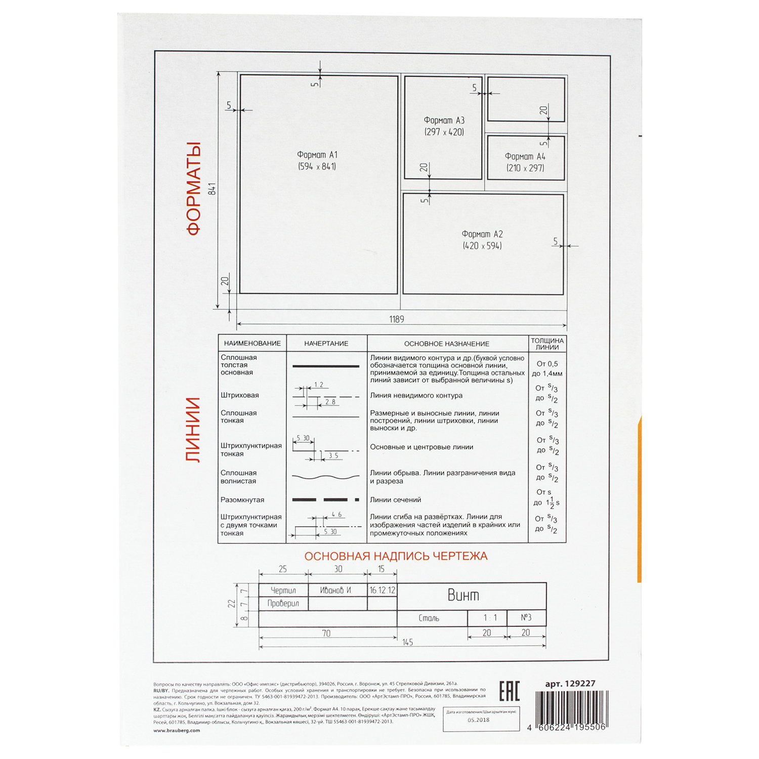 Папка для черчения BRAUBERG представляет собой набор из 10 листов ватмана производства ГОЗНАК КБФ. Папка для черчения включает отдельные листы рисовальной бумаги формата А4 (210х297 мм) плотностью 200 г/м2. Обложка выполнена из импортного мелованного картона плотностью 200 г/м2.