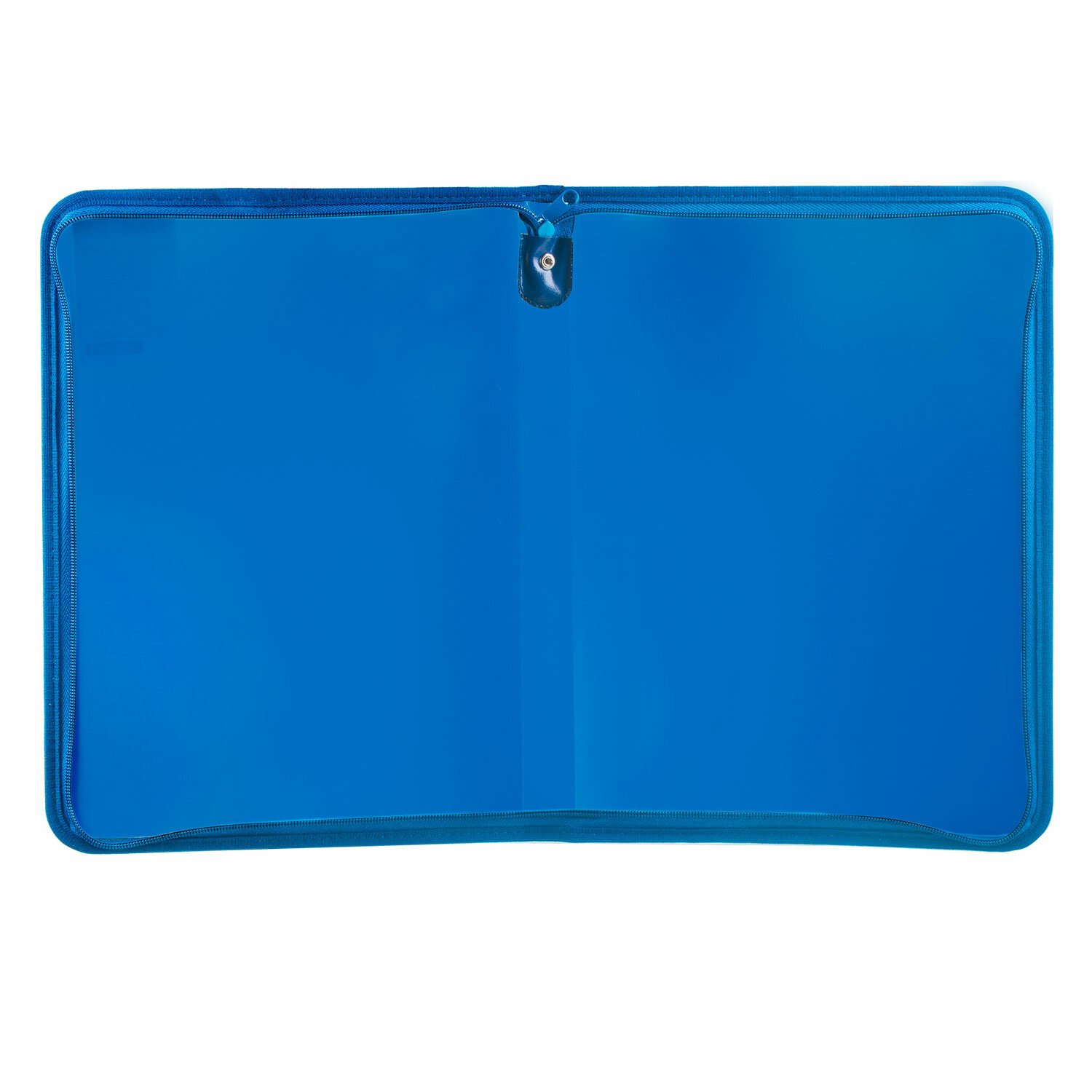 Изготовлена из прочного пластика синего цвета толщиной 0,5 мм. Формат А4 (320х230 мм). Надежный замок-молния защищает документы от механических повреждений, а также пыли и влаги. Цвет молнии - синий.