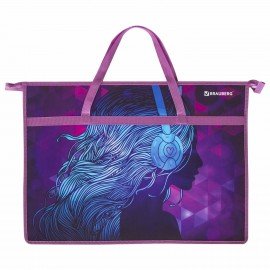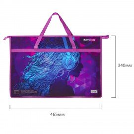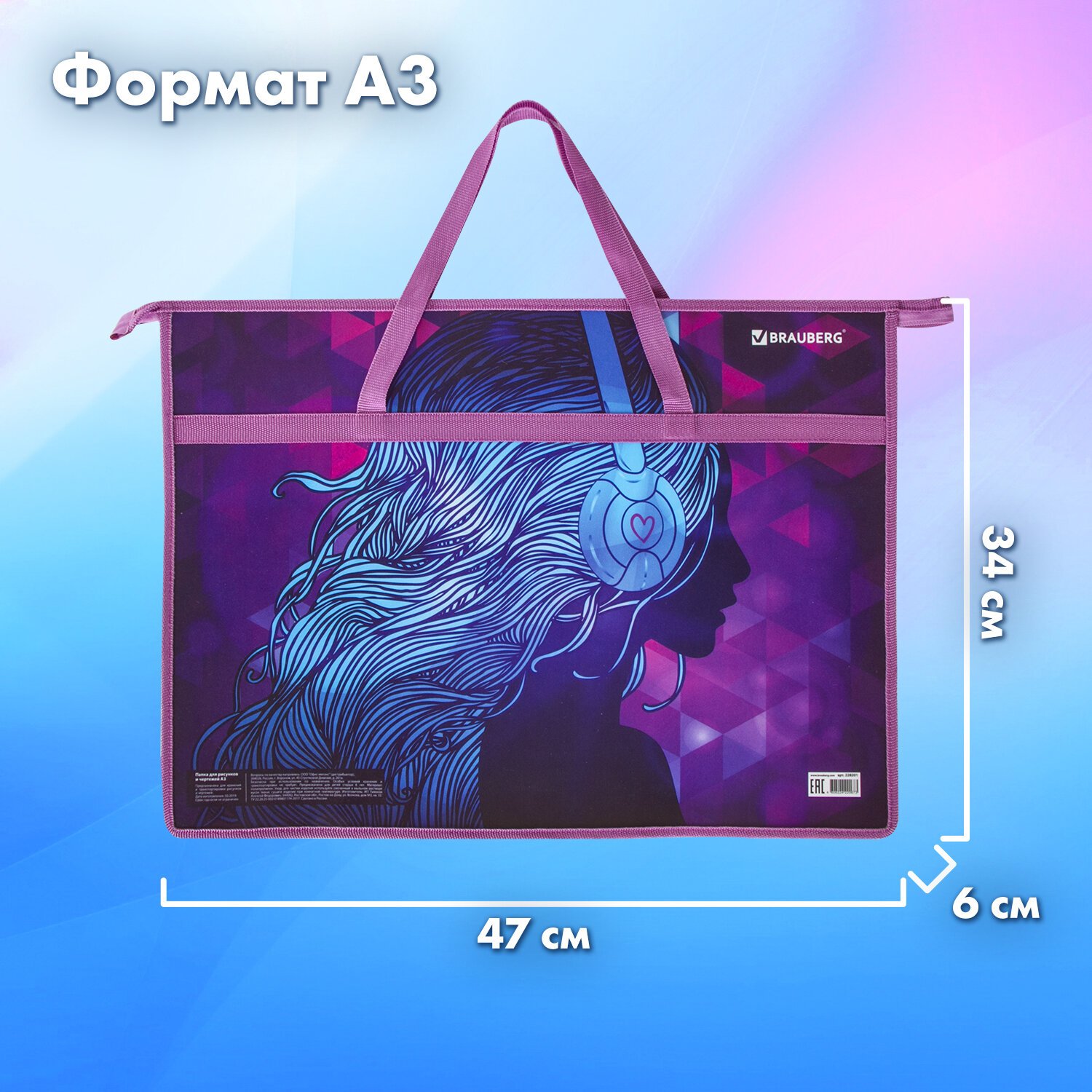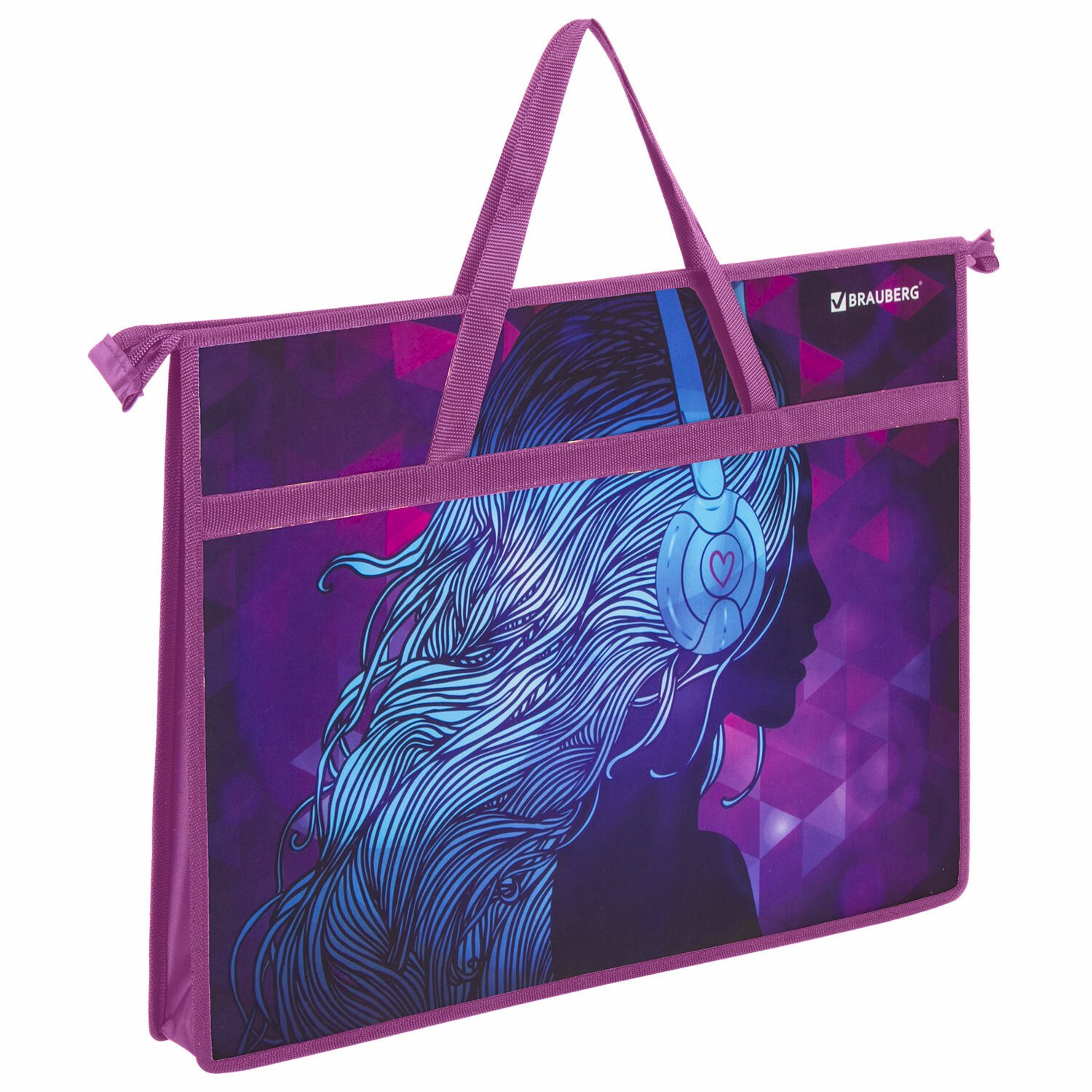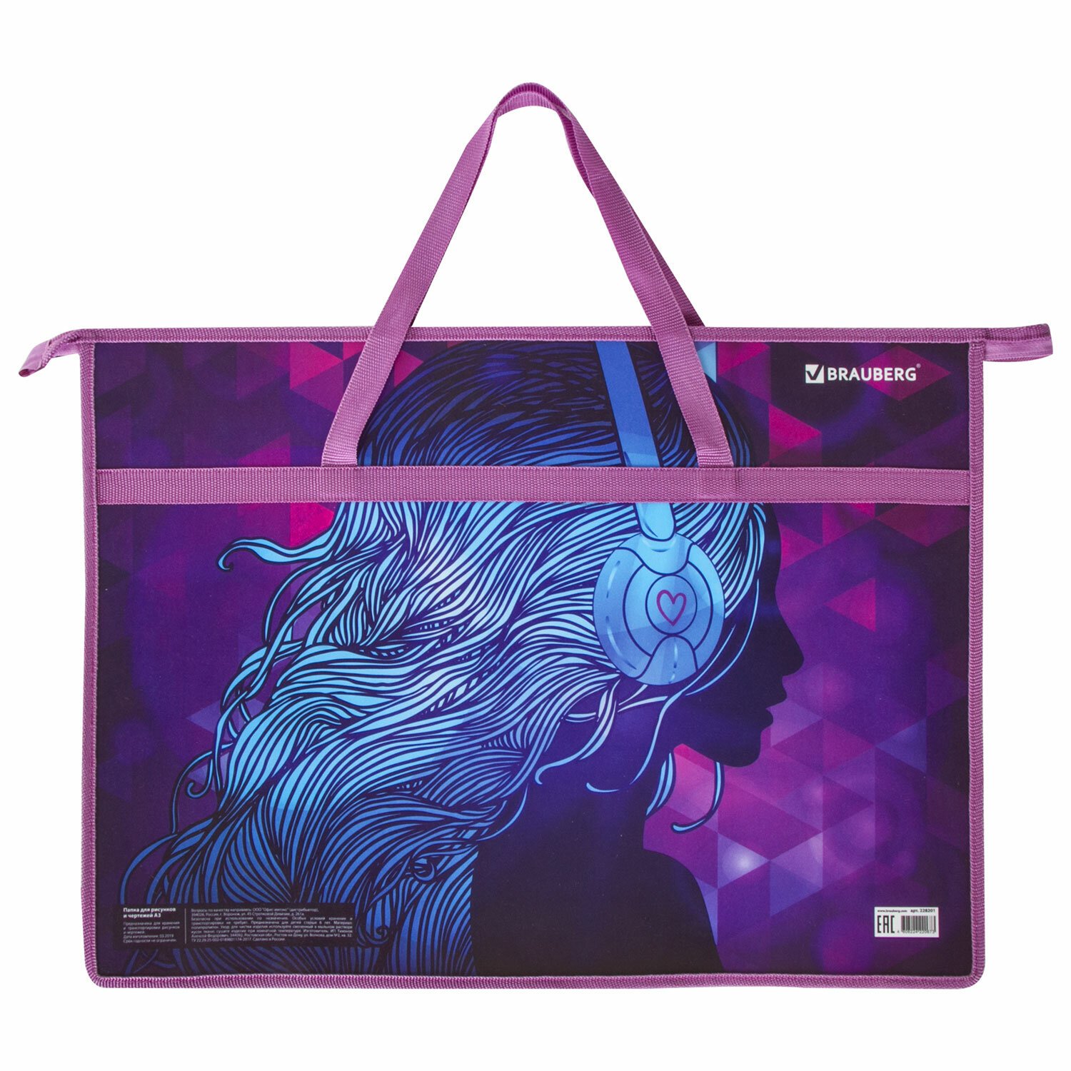 Папка BRAUBERG "Melody" предназначена для хранения чертежей, рисунков и других художественных изображений. Выполнена из пластика, по краям имеет тканевую окантовку. Одно отделение. Застежка-молния расположена по верхнему краю папки. Цветная печать.