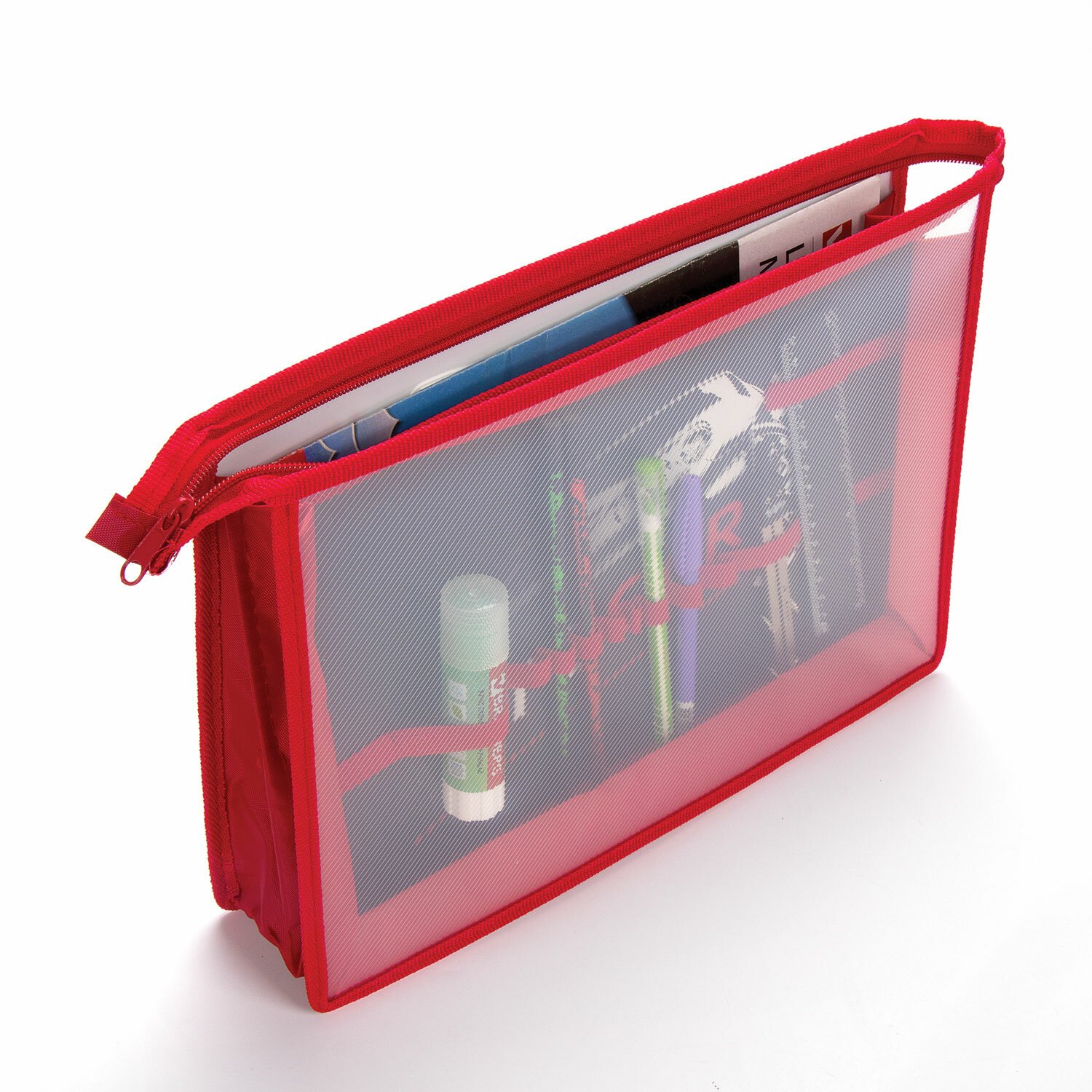 Боковые стороны и дно имеют вставку из ткани, которая позволяет увеличить объем папки. Надежная застежка-молния расположена по верхнему краю папки.