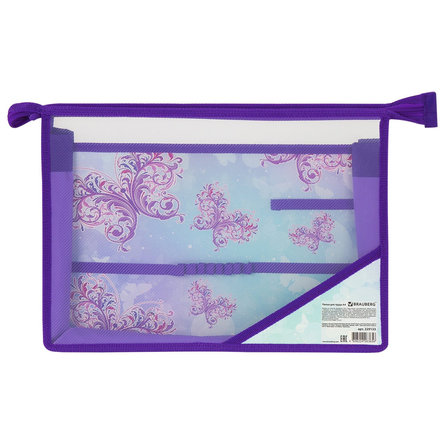 Папка для труда BRAUBERG А4, 2 отделения, пластик, молния сверху, органайзер, "Butterfly", 229133