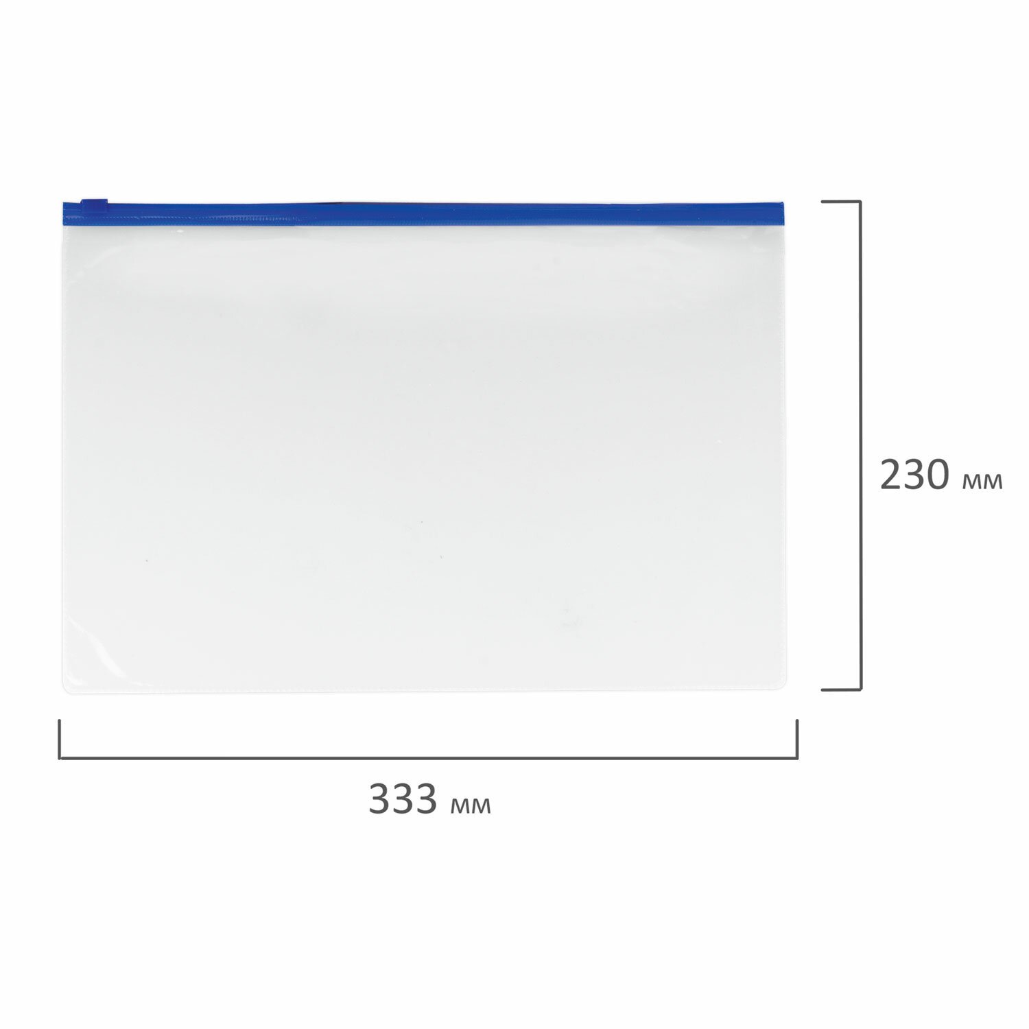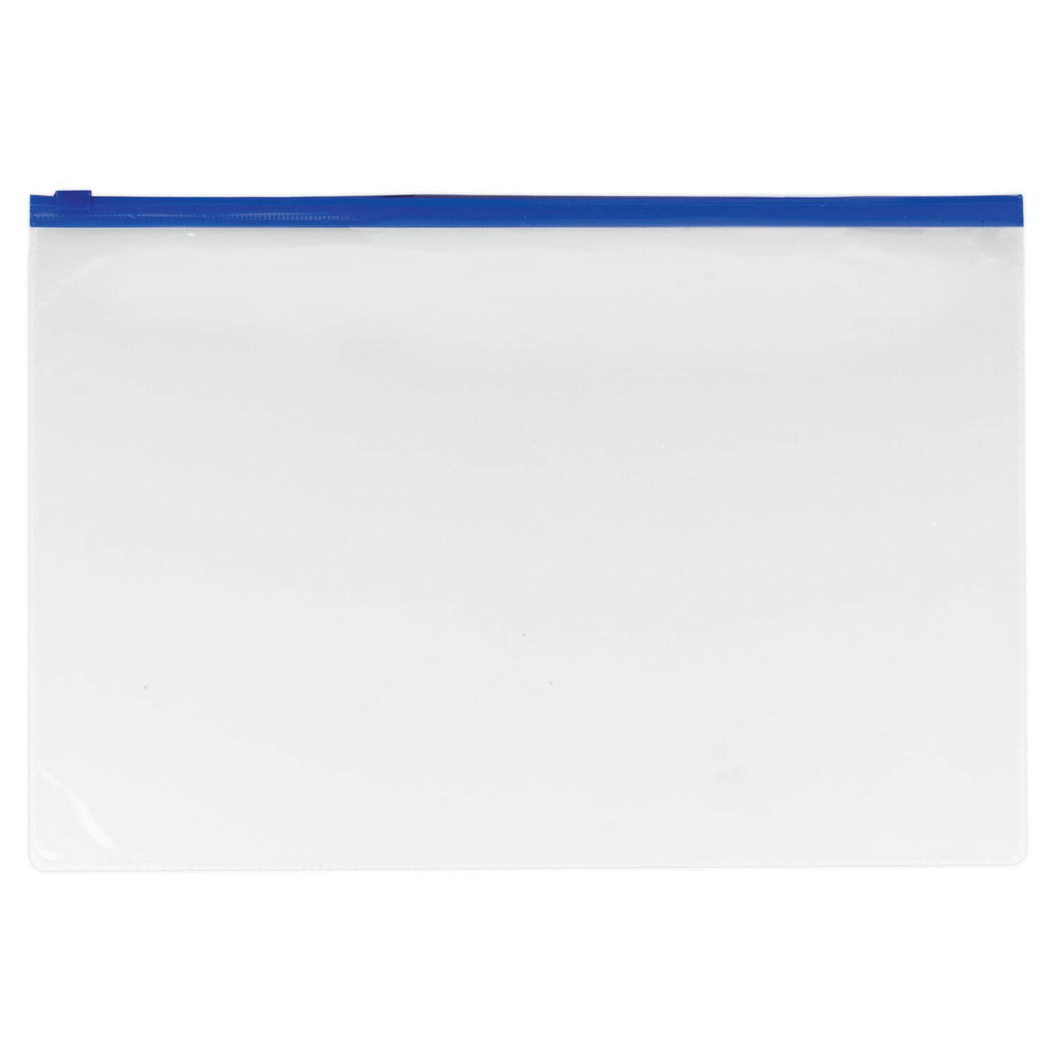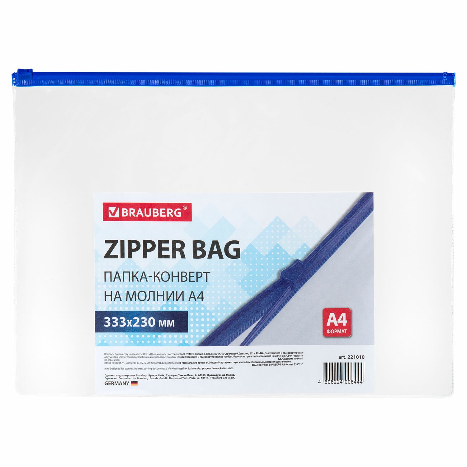 Папка-конверт на молнии А4 (230х333 мм), прозрачная, молния синяя, 0,11 мм, BRAUBERG, 221010