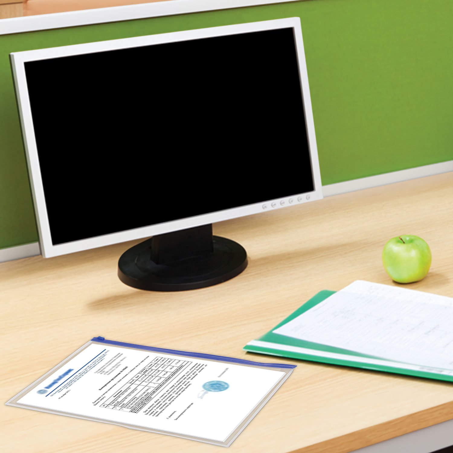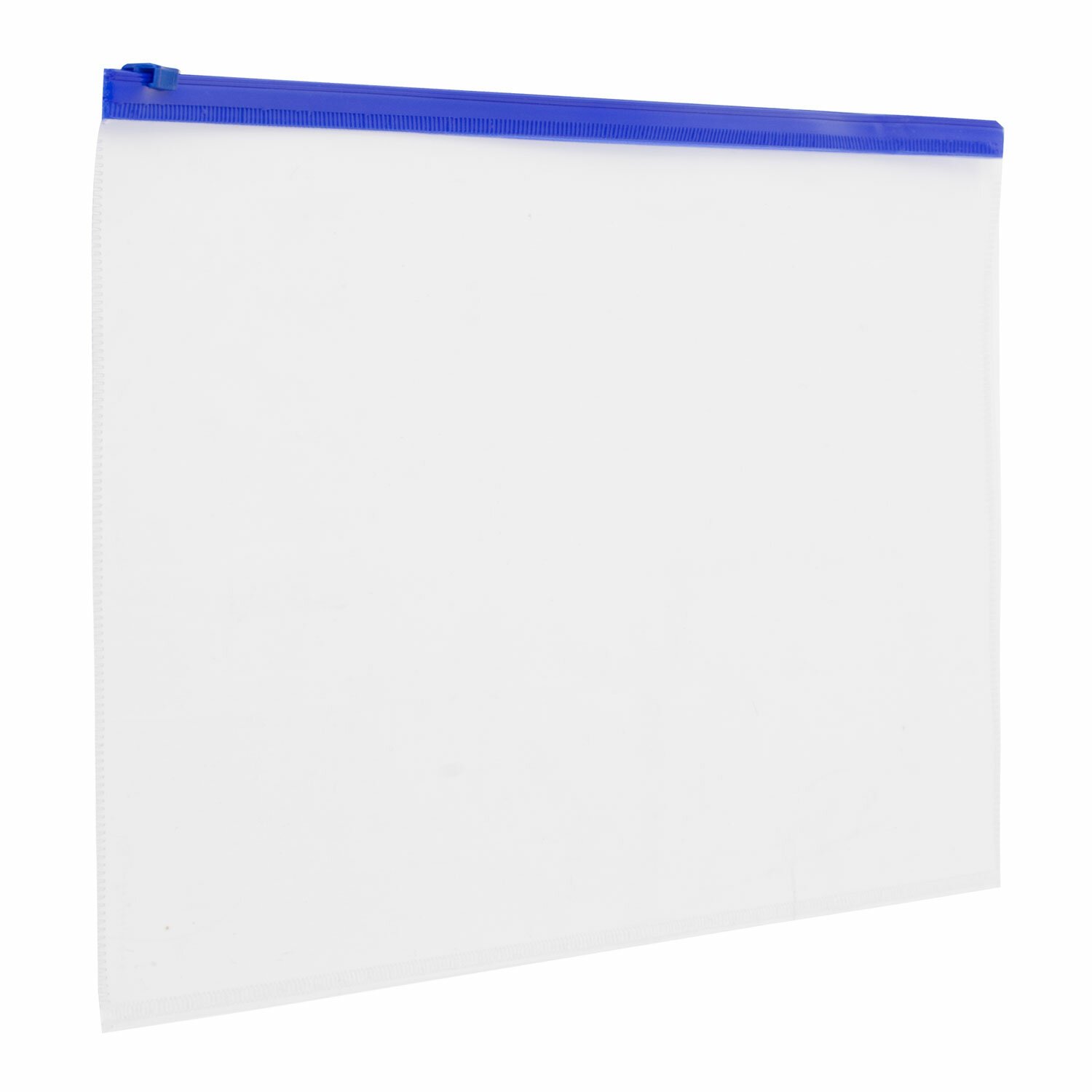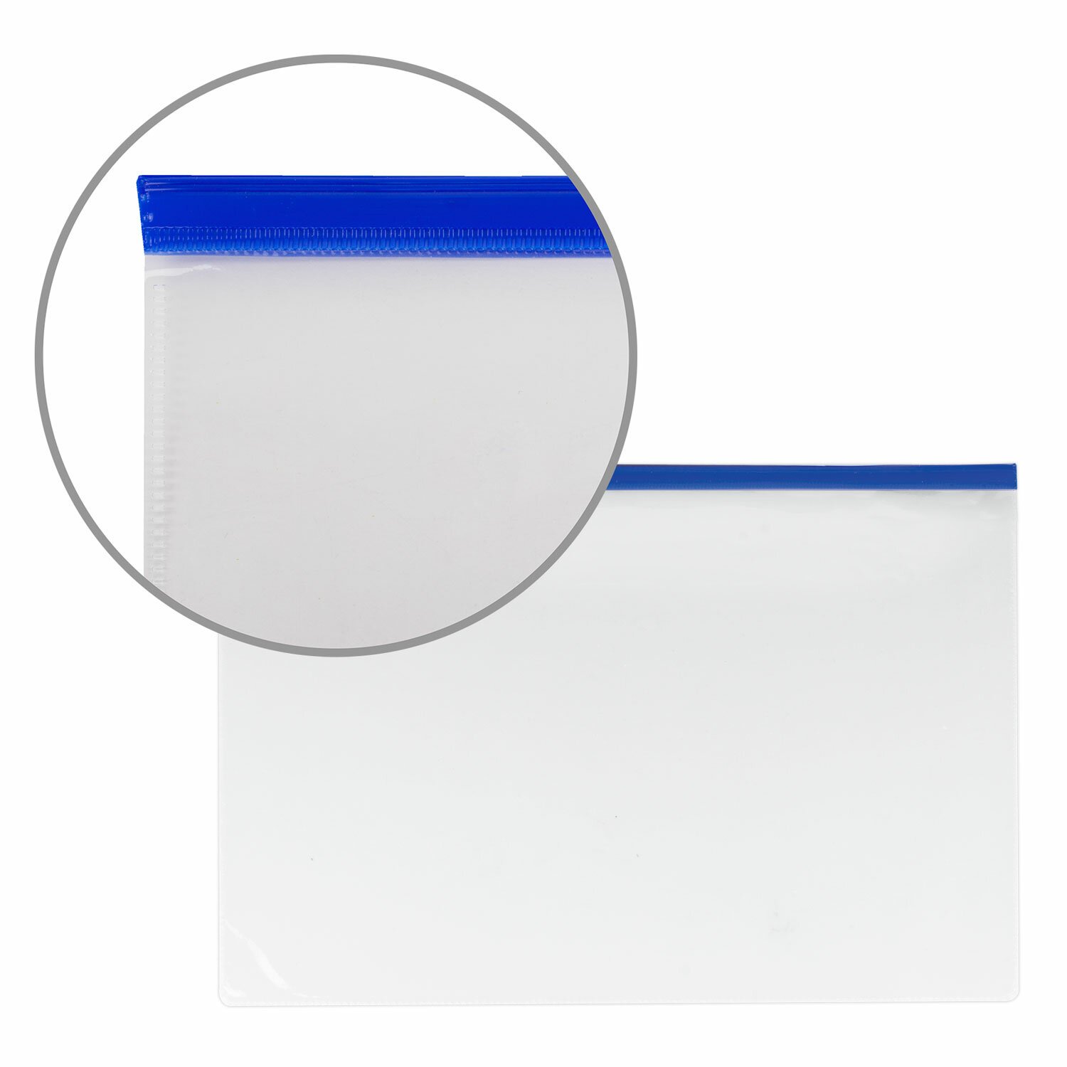 Изготовлена из прочного прозрачного пластика толщиной 0,11 мм с гладкой фактурой. Формат А4 (333х230 мм). Герметичная застежка-зиплок защищает документы от механических повреждений, а также пыли и влаги. Цвет молнии – синий.