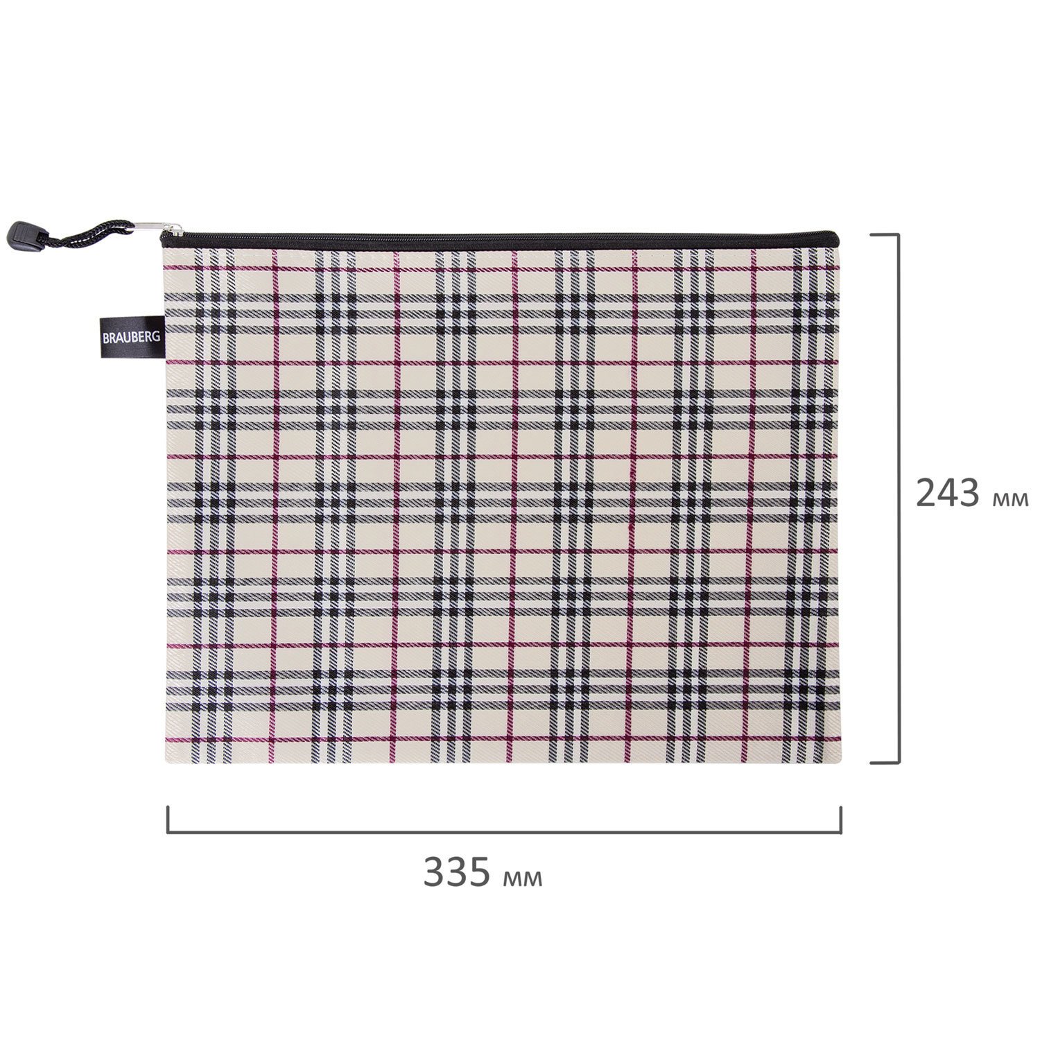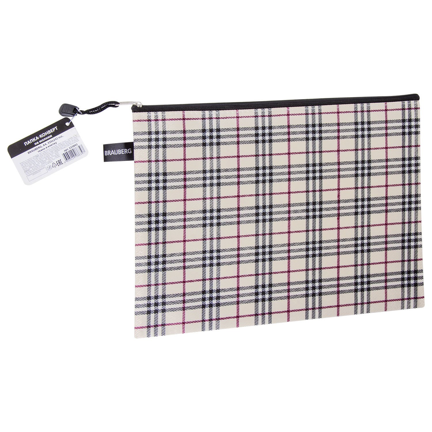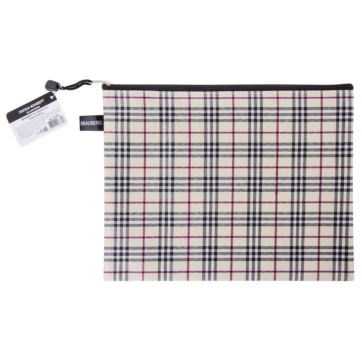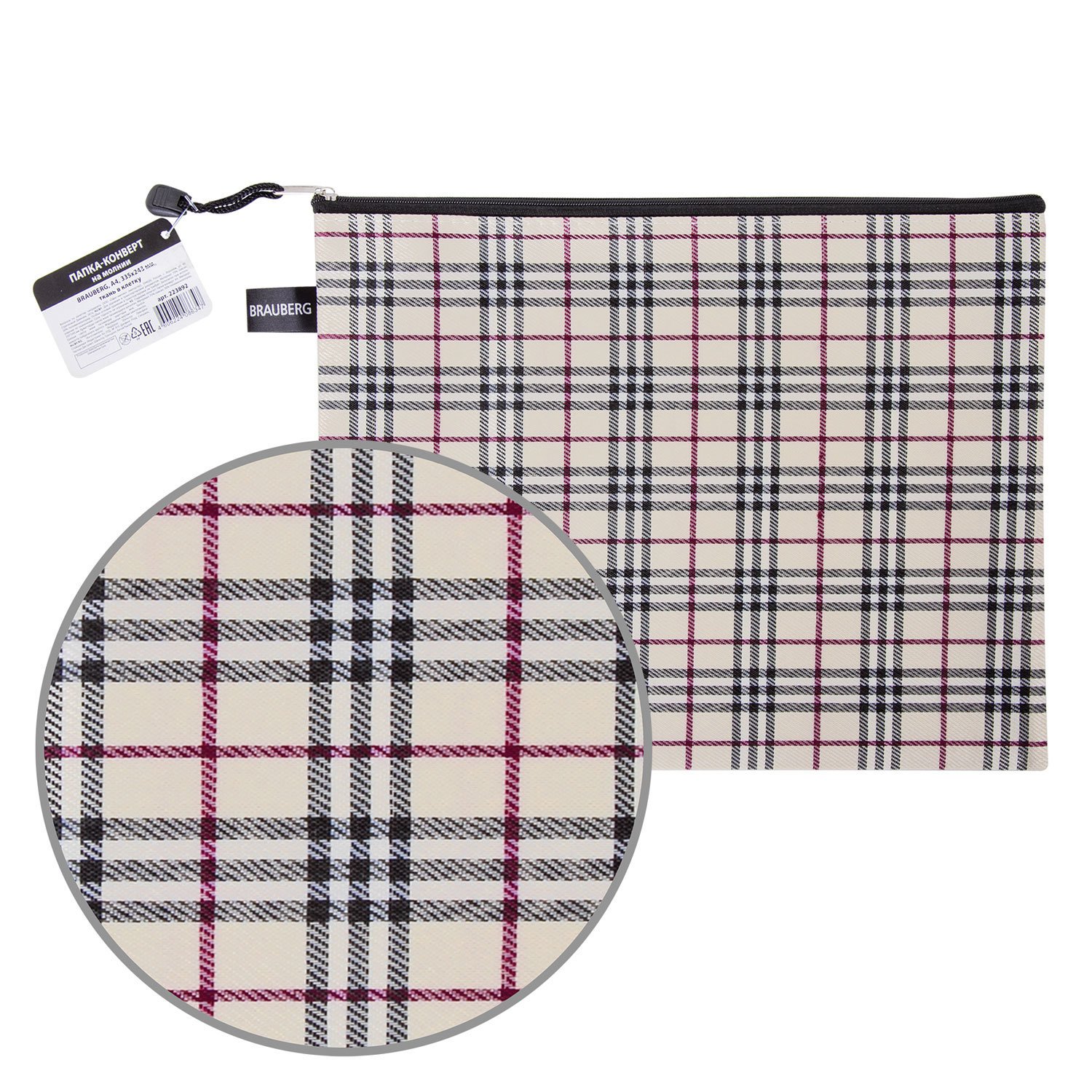 Папка-конверт на молнии А4 (335х243 мм), ткань в клетку, BRAUBERG "Checked", 223892