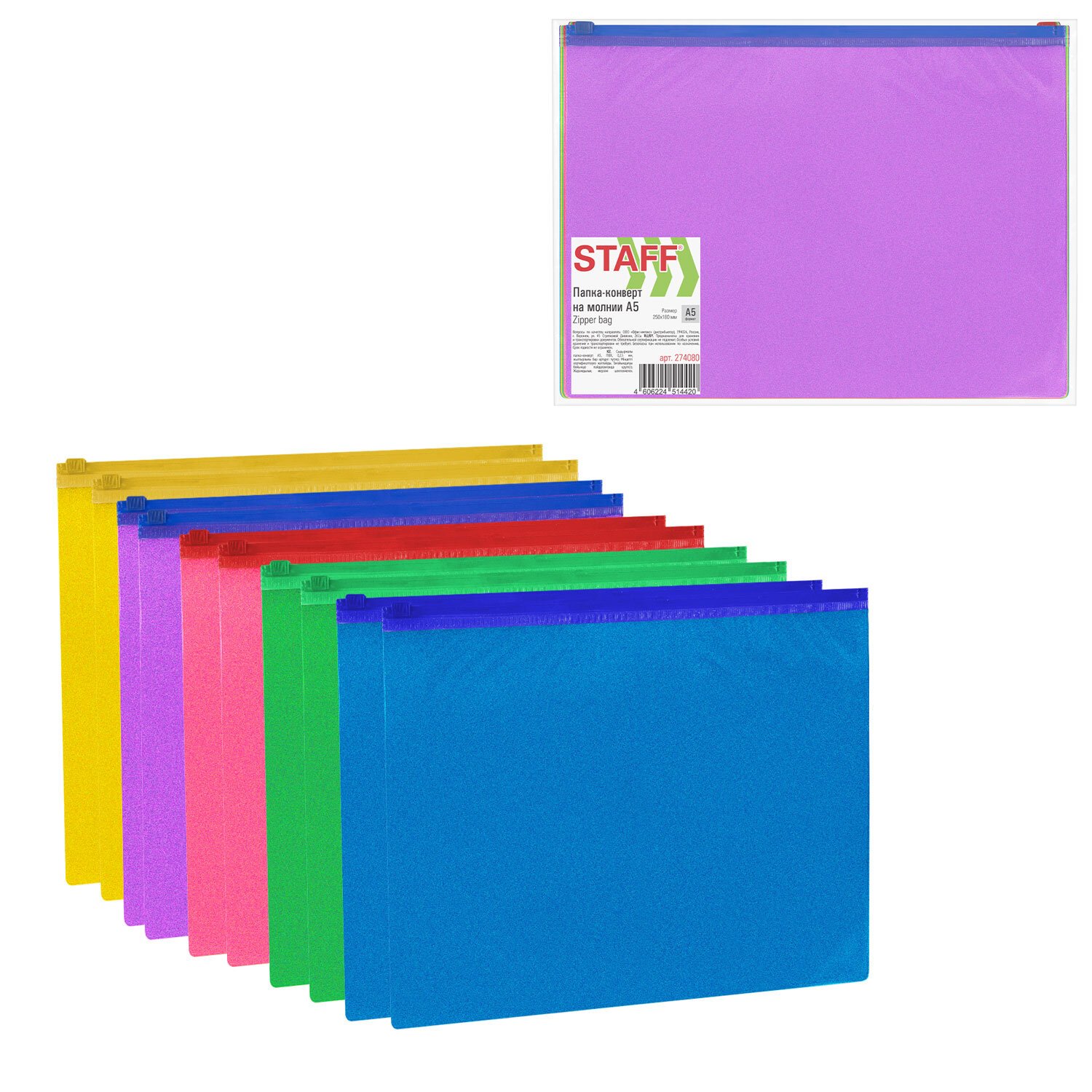 Папка-конверт на молнии МАЛОГО ФОРМАТА (180х250 мм) А5, цвет ассорти с блестками, 0,15 мм, STAFF, 274080