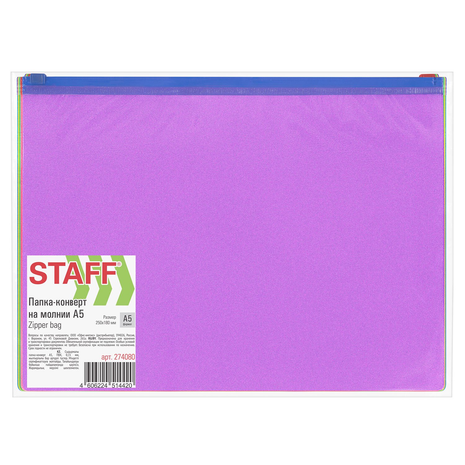 Папка-конверт на молнии А4 (230х333 мм), ПВХ, цвет ассорти/прозрачная, 0,15 мм, STAFF, 274076