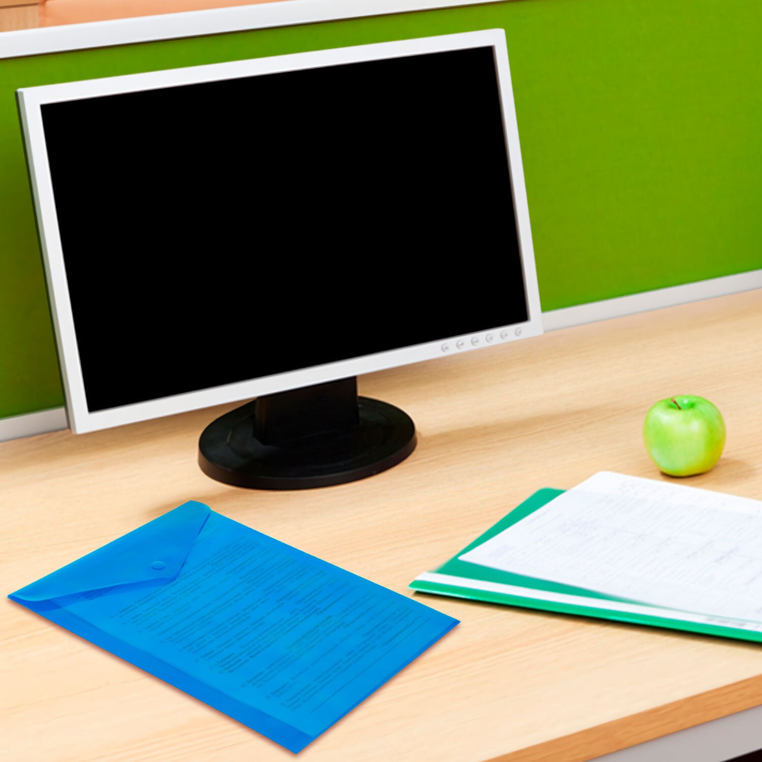 Папка-конверт с гладкой фактурой формата А4 изготовлена из плотного пластика толщиной 150 мкм. Закрывается на защелку-кнопку, что делает удобным частое использование и обеспечивает быстрый доступ к ее содержимому. Папка способна вместить до 100 листов стандартной плотности.