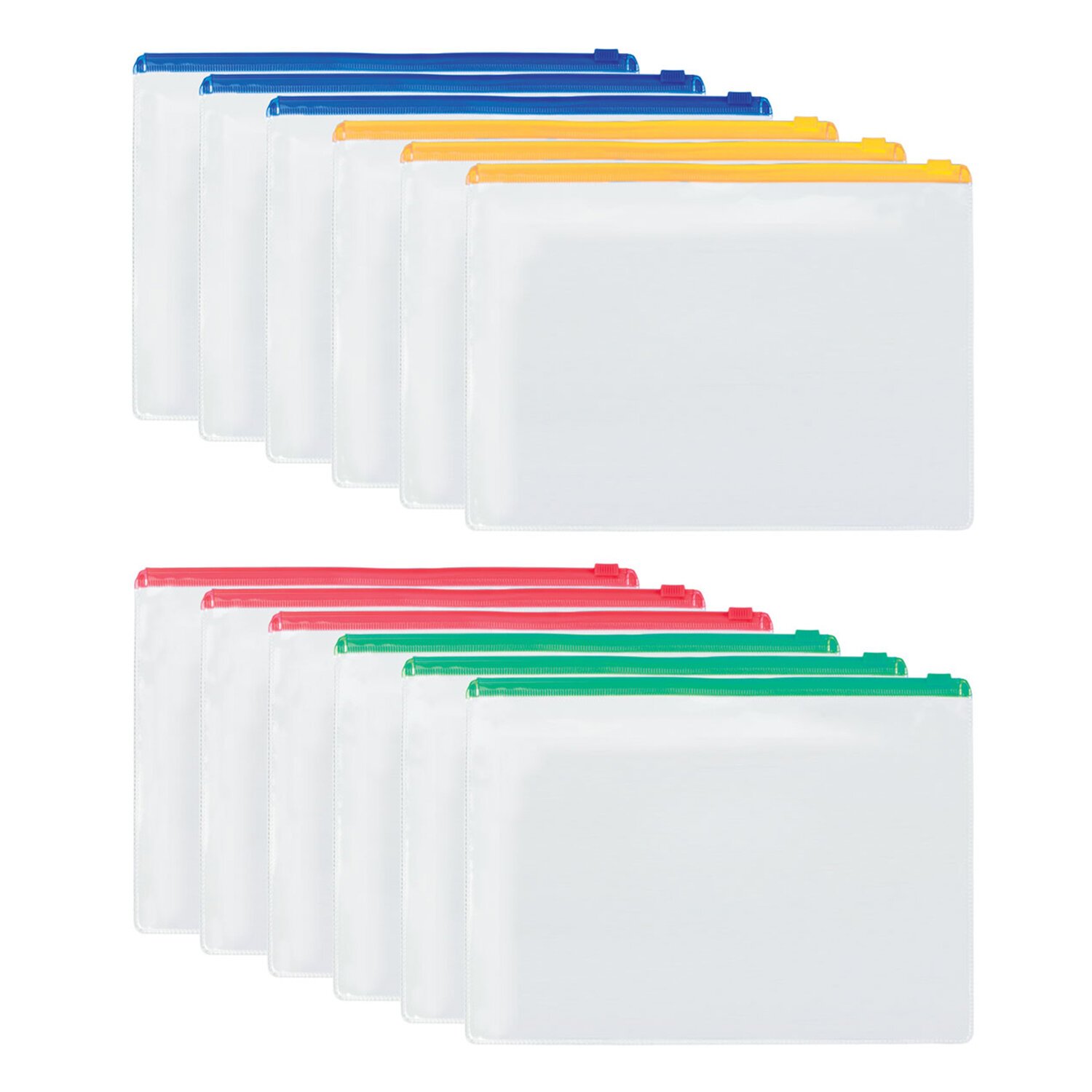 Папки-конверты изготовлены из прозрачного пластика толщиной 0,12 мм с гладкой фактурой. Формат А4 (335х238 мм). Герметичная застежка-зиплок защищает документы от механических повреждений, а также пыли и влаги. Цвет молнии - ассорти (3 синих, 3 красных, 3 желтых, 3 зеленых).