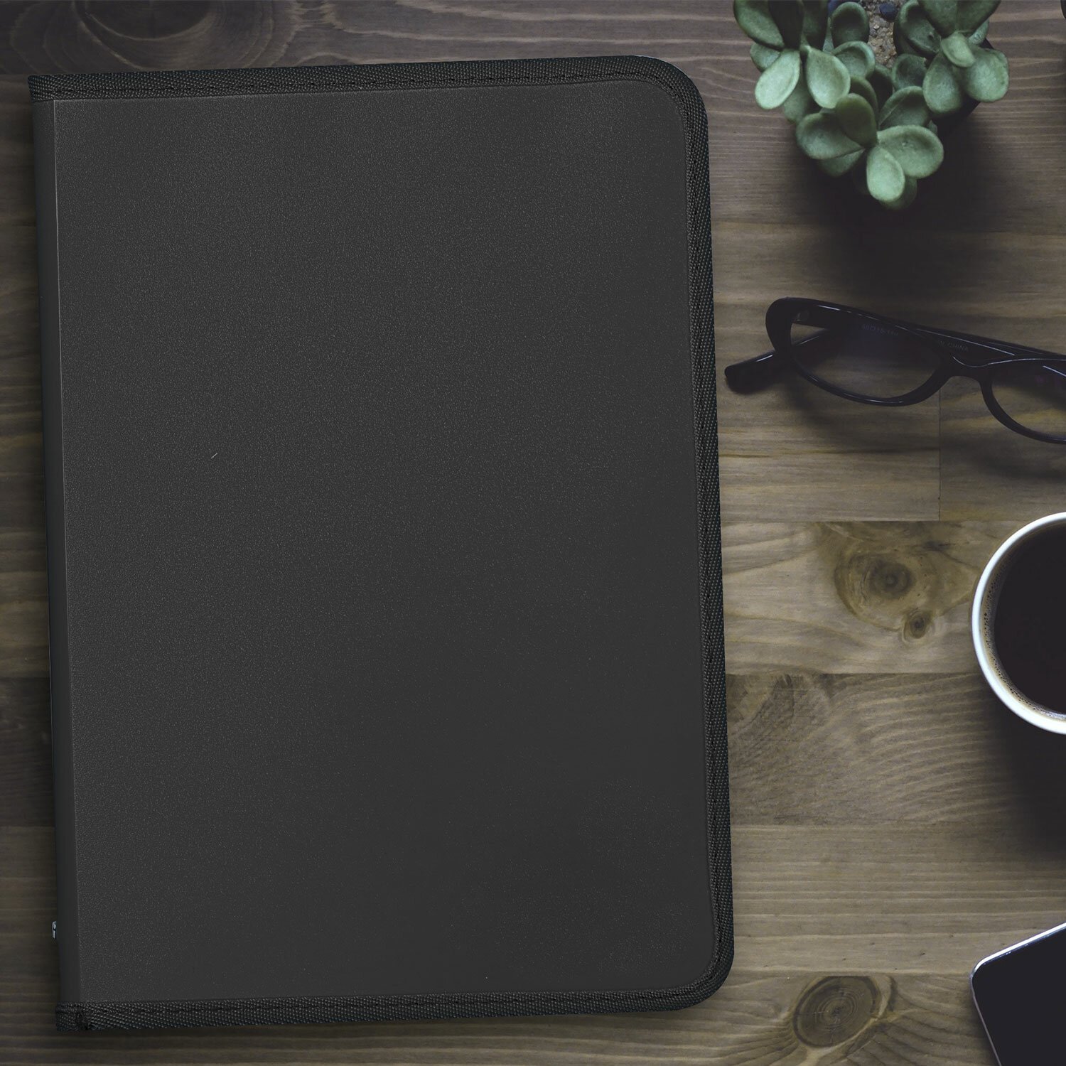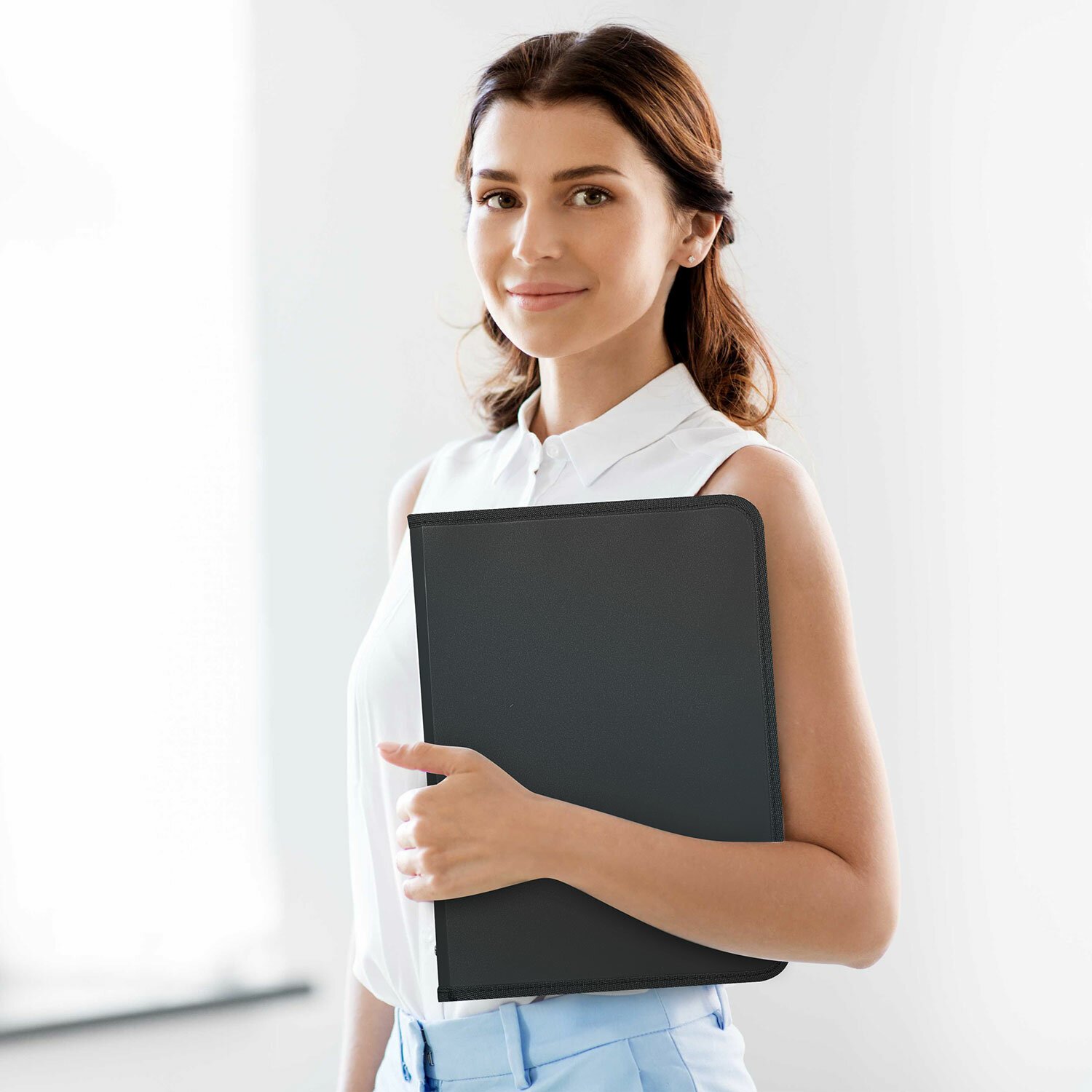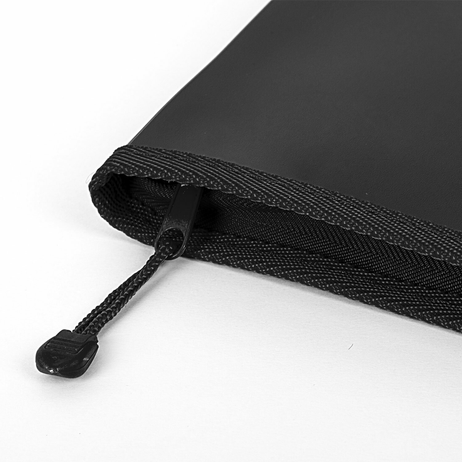 Изготовлена из прочного матового пластика толщиной 0,5 мм. Формат А4 (325х230 мм). Надежный замок-молния защищает документы от механических повреждений, а также пыли и влаги. Цвет папки - черный.