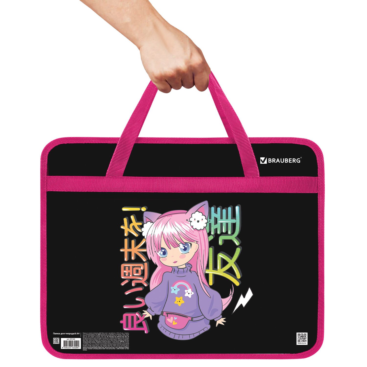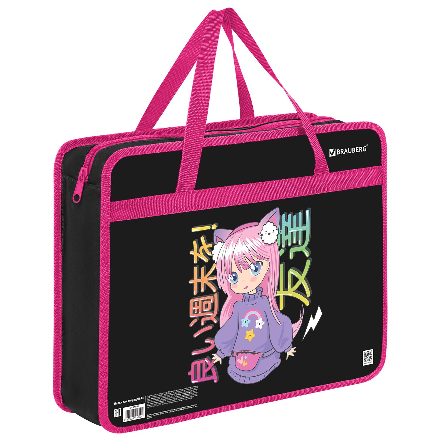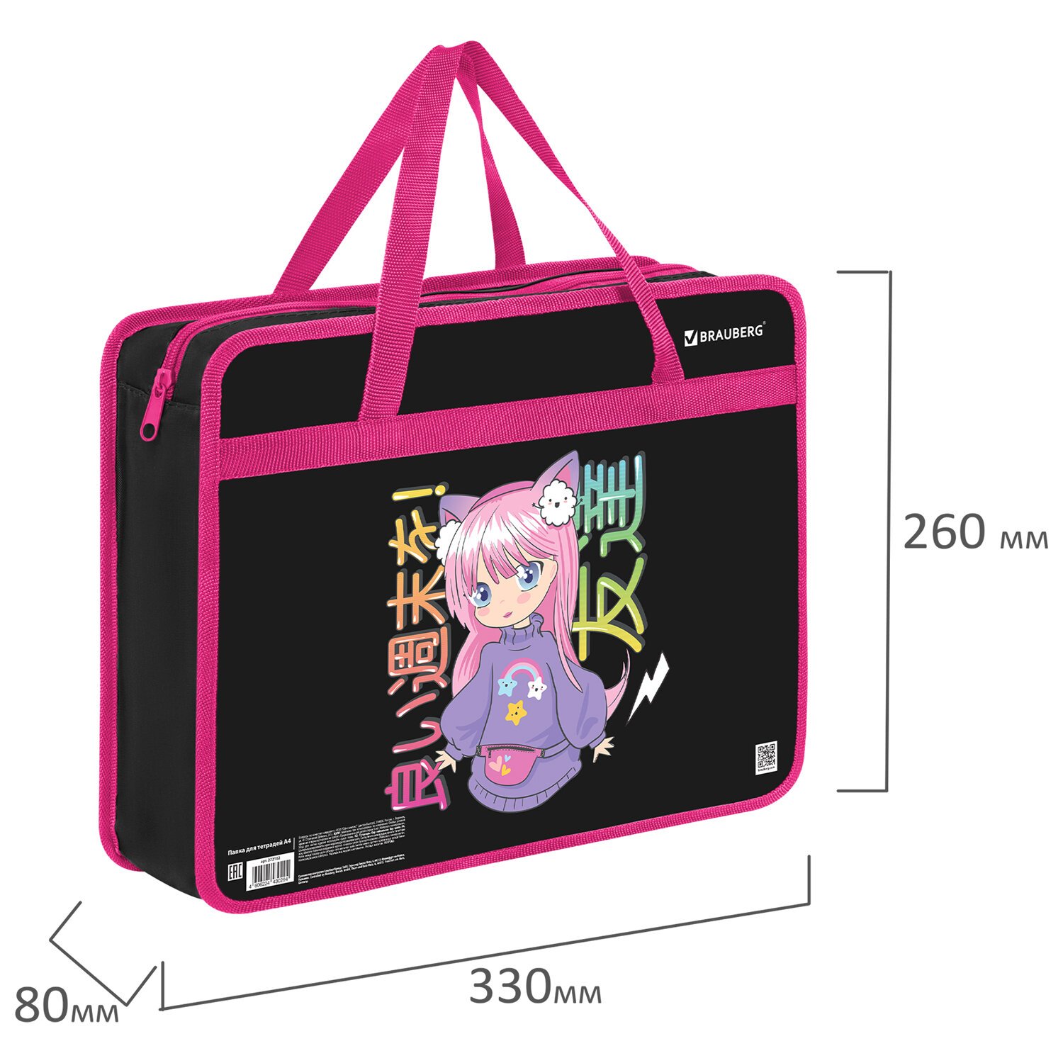 Папка на молнии с ручками BRAUBERG А4, 1 отделение, пластик, 80 мм, "Anime girl", 272162
