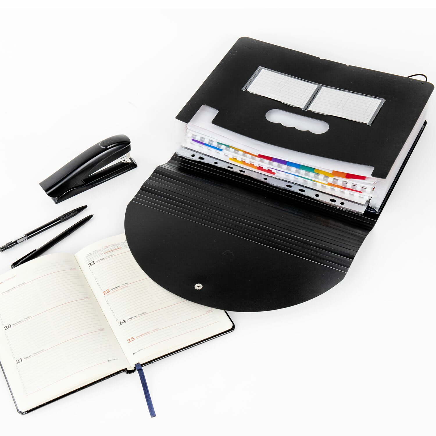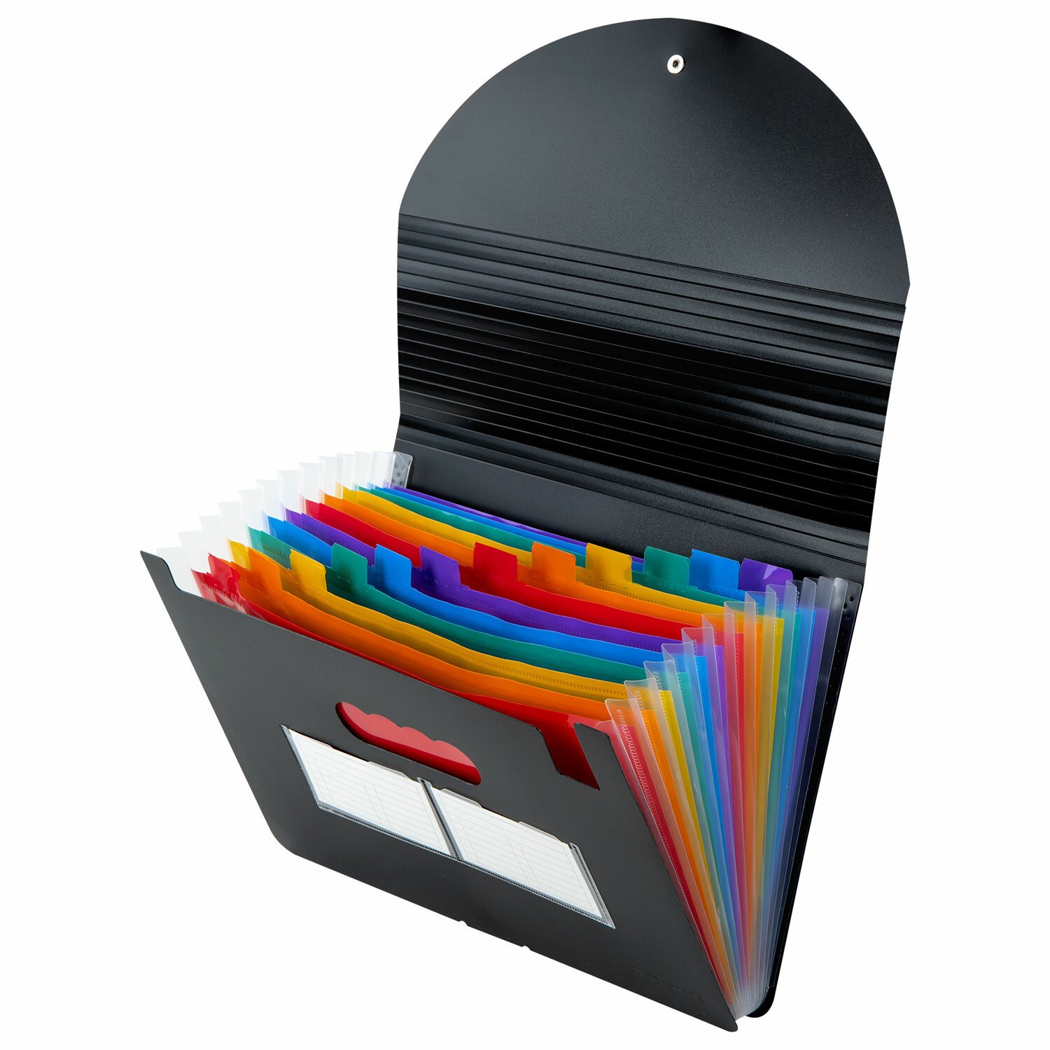 Изготовлена из качественного пластика толщиной 0,8 мм с фактурой под песок. Содержит 13 цветных отделений, которые позволяют структурировать большое количество документов. Для удобства поиска нужного документа разделители снабжены индексными ярлыками. Удобный замок позволяет быстро закрывать и открывать папку, не позволяя содержимому выпасть, и защищая от влаги, пыли и прочих механических повреждений. На лицевой стороне имеются 2 кармана для визиток. Папка представлена в солидном черном цвете.