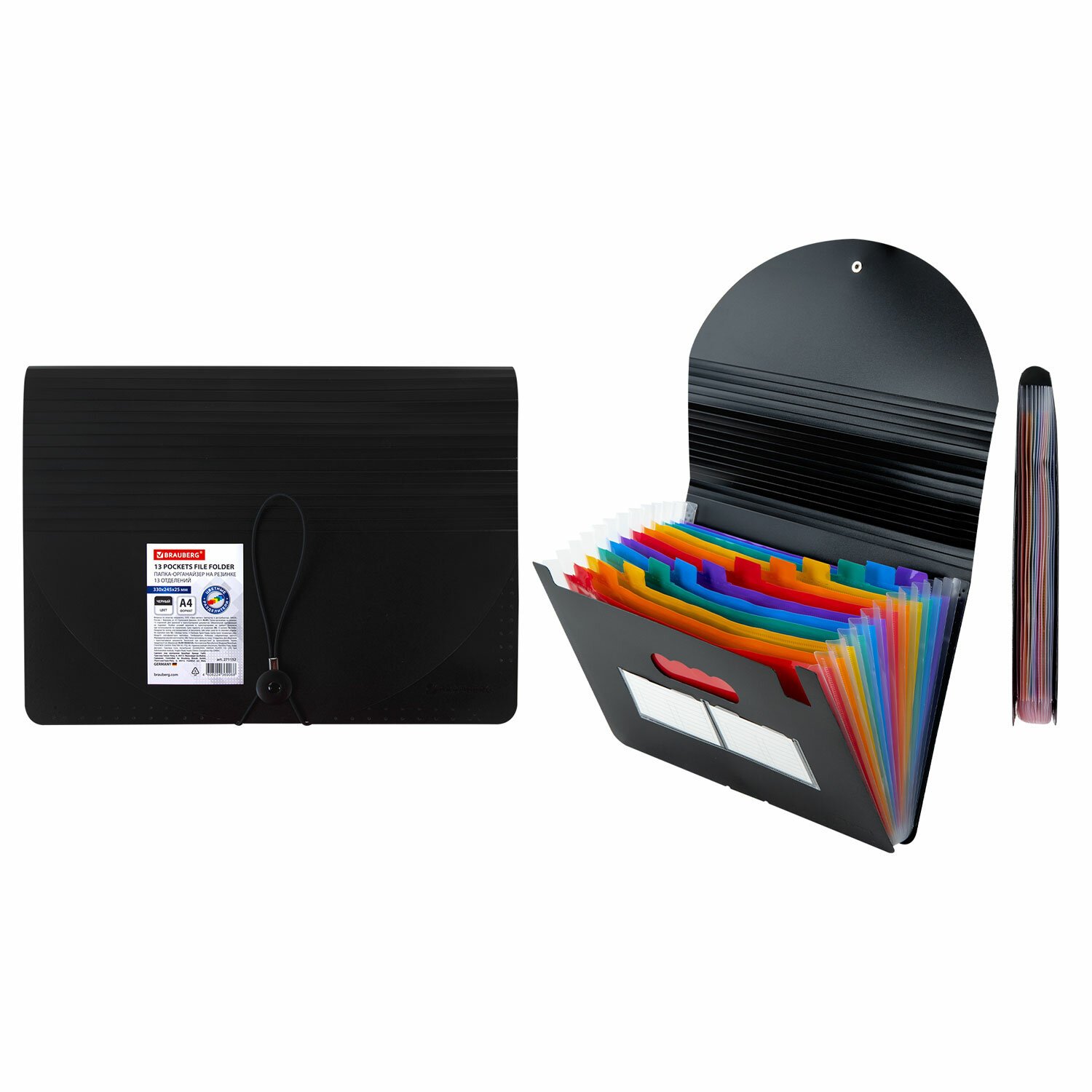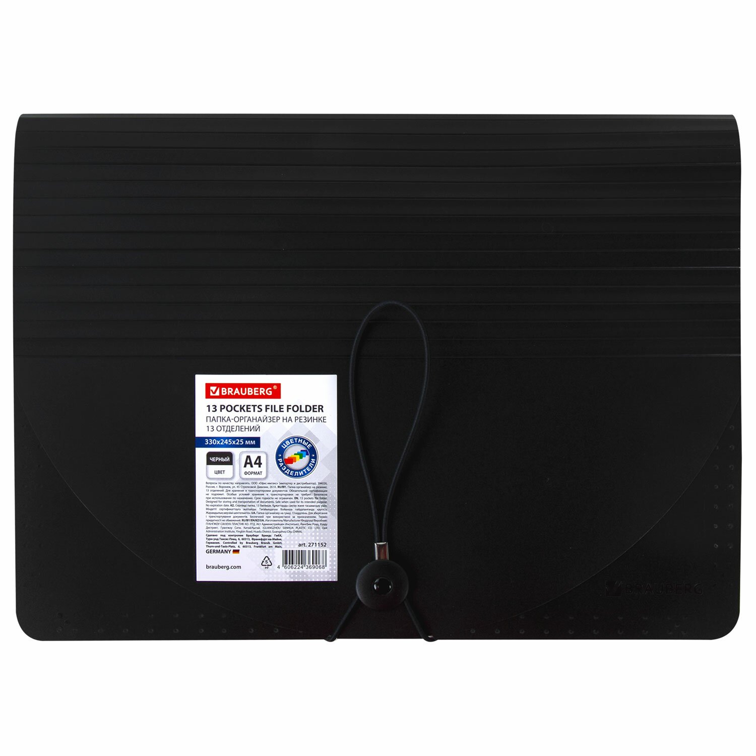 Папка-органайзер для бумаг и документов на резинке, 13 отделений, BRAUBERG DOCS, А4, черная, 271152