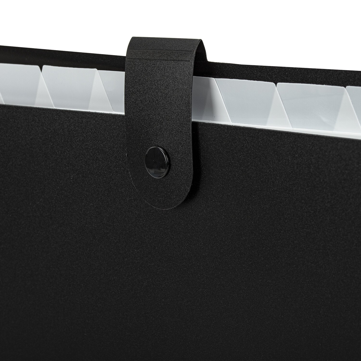 Папка-органайзер изготовлена из качественного пластика солидного черного цвета толщиной 0,5 мм с фактурой 'песок', снабжена разделителями белого цвета.