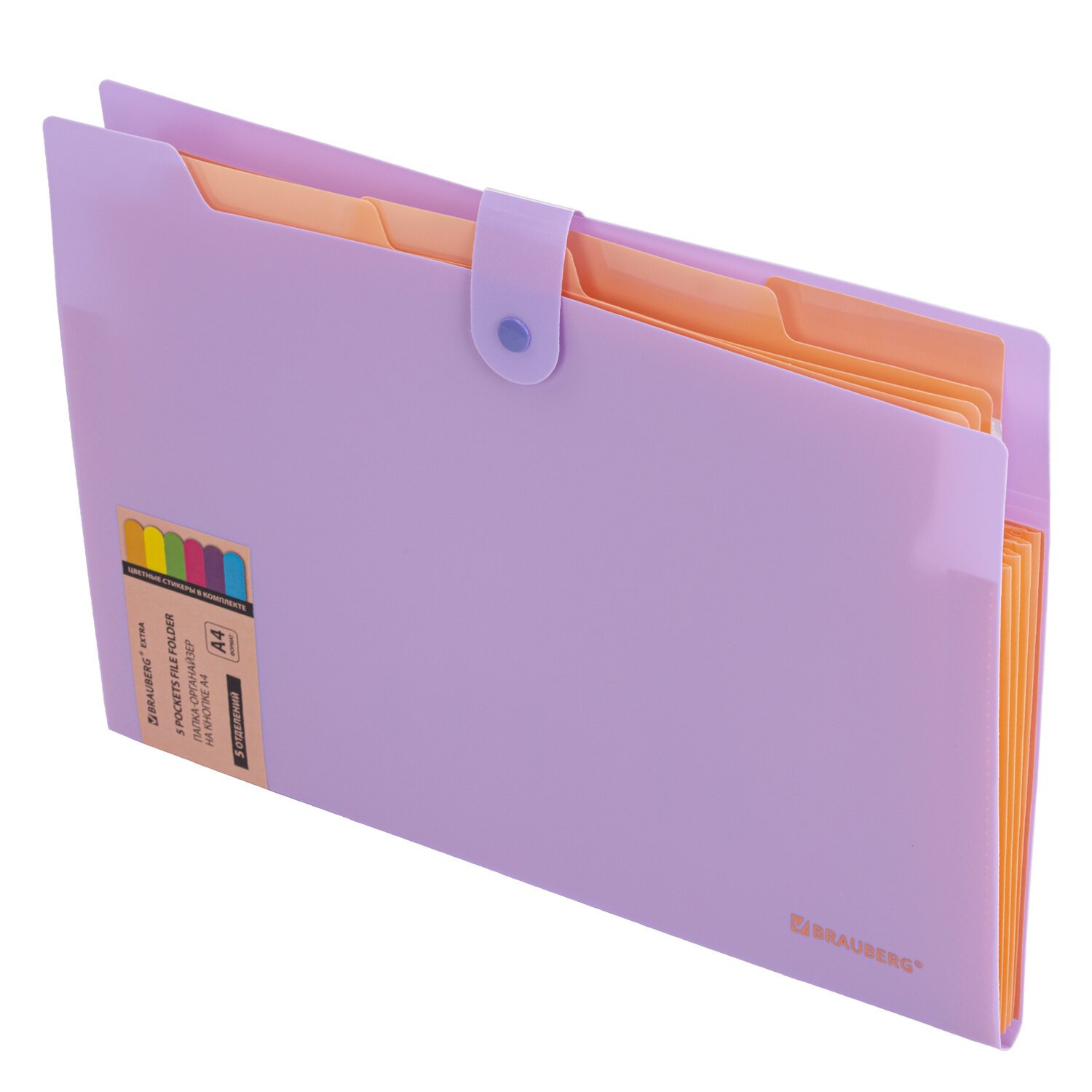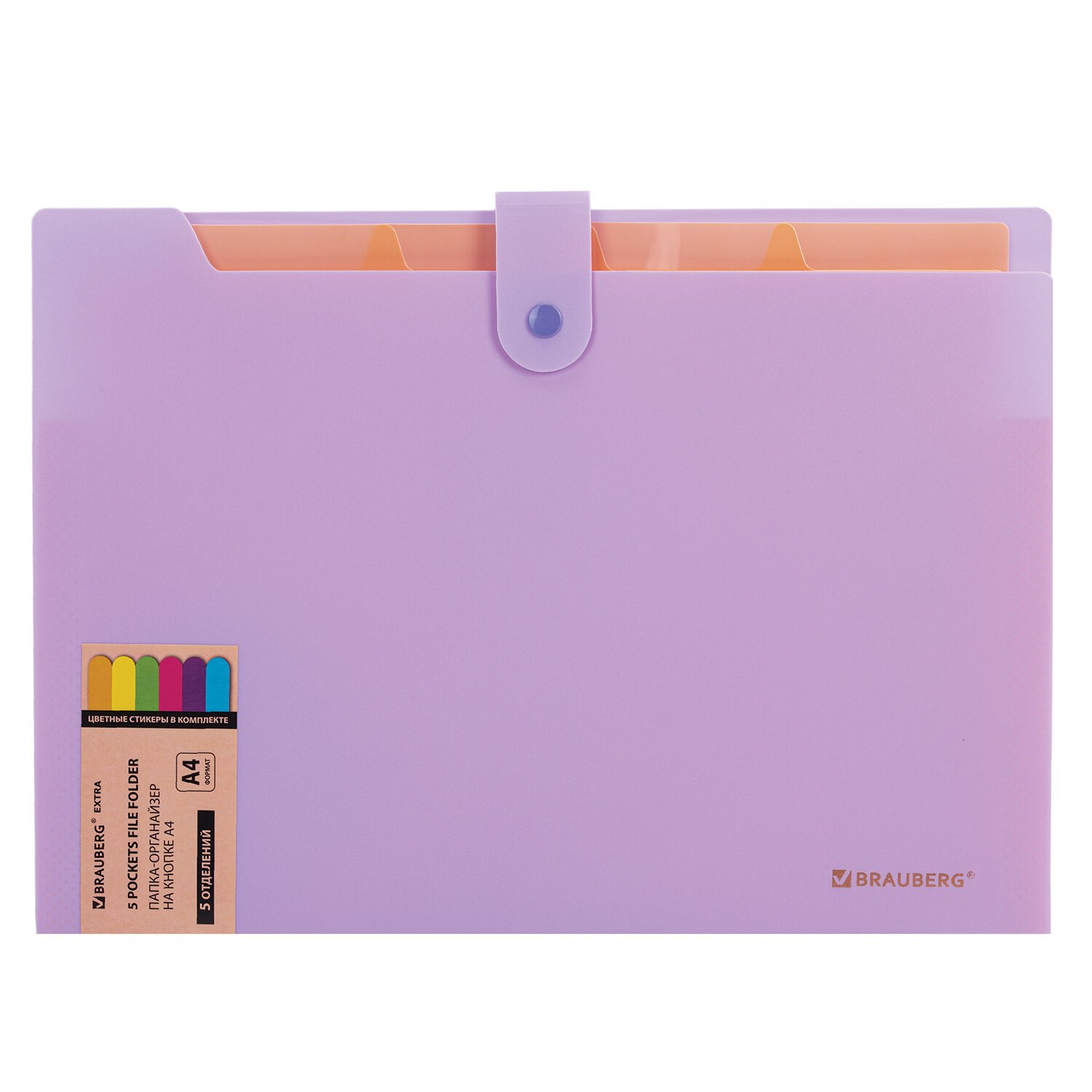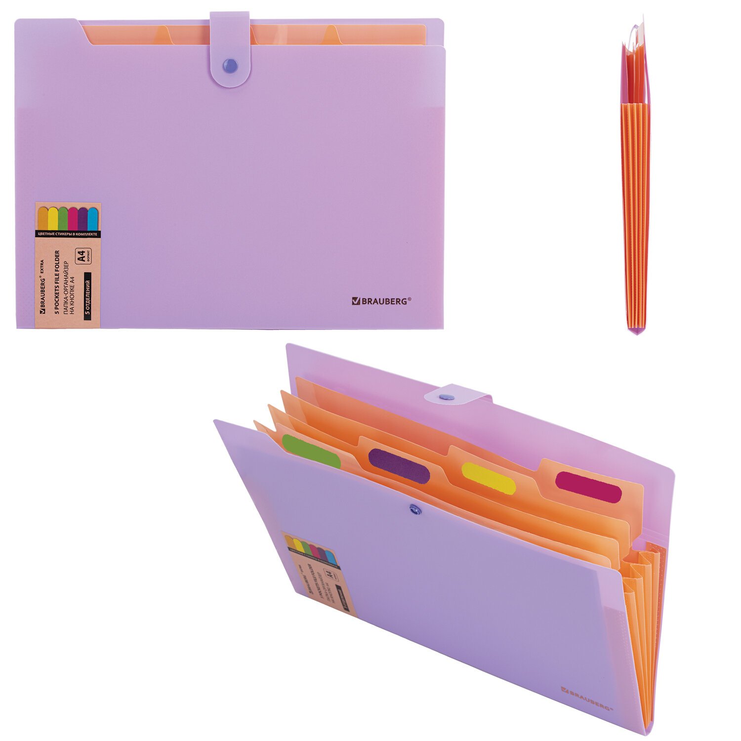 Папка-органайзер на кнопке 5 отделений, BRAUBERG "Extra", А4, лиловая с персиковым, 274098