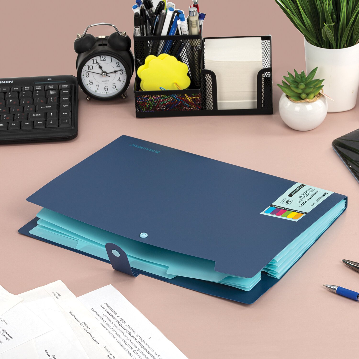 Имеет 5 отделений с ярлыками на разделителях и яркими стикерами (в комплекте), что существенно упрощает процесс поиска нужного документа и позволяет структурировать информацию. Удобный и надежный замок-кнопка дает возможность быстро открывать и закрывать папку, не позволяя содержимому выпасть, и защищает его от влаги, пыли и механических повреждений.