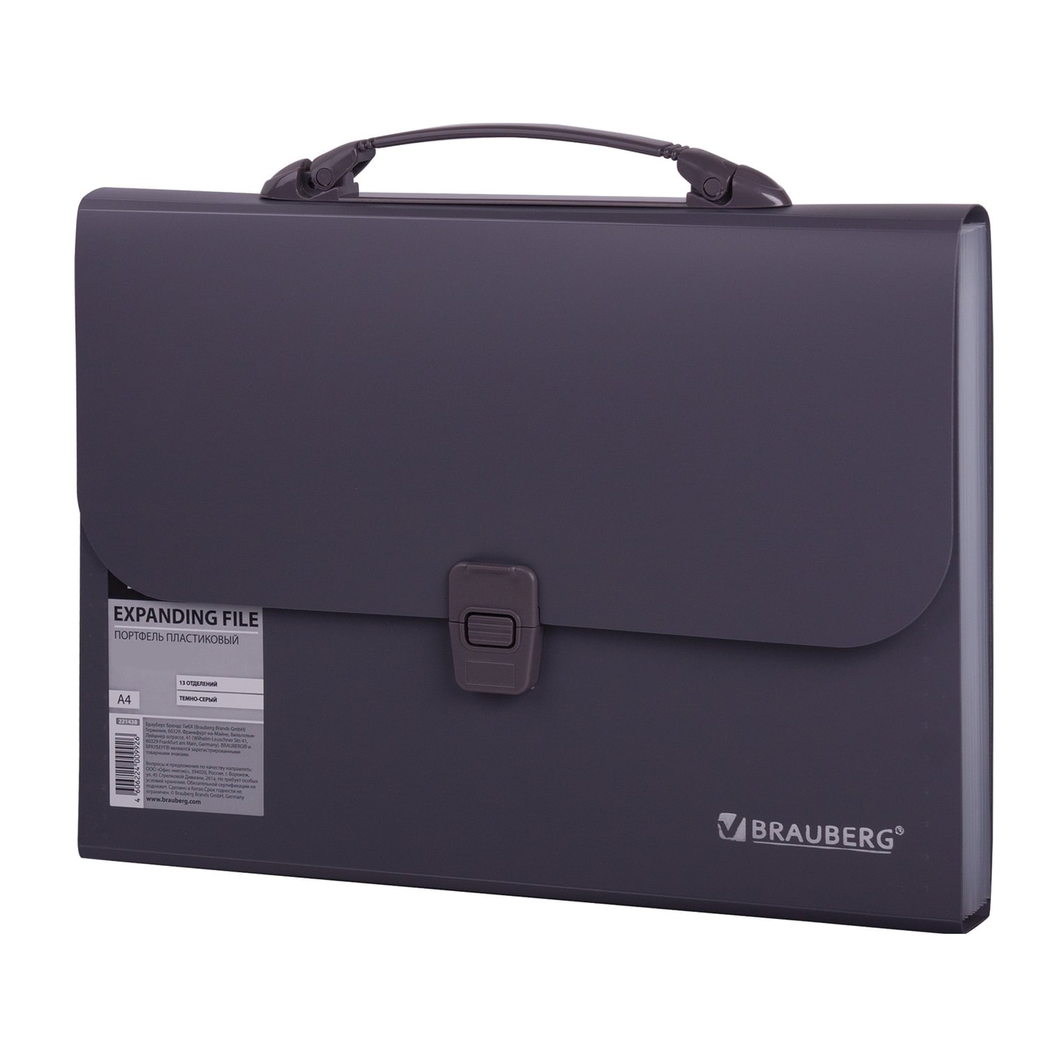 Портфель формата А4 (327х254х30 мм) изготовлен из плотного пластика стандартной фактуры толщиной 0,7 мм, выполнен в солидном темно-сером цвете и имеет 13 отделений с индексными ярлыками. Складная ручка обеспечивает компактность изделия. Портфель застегивается на клапан.