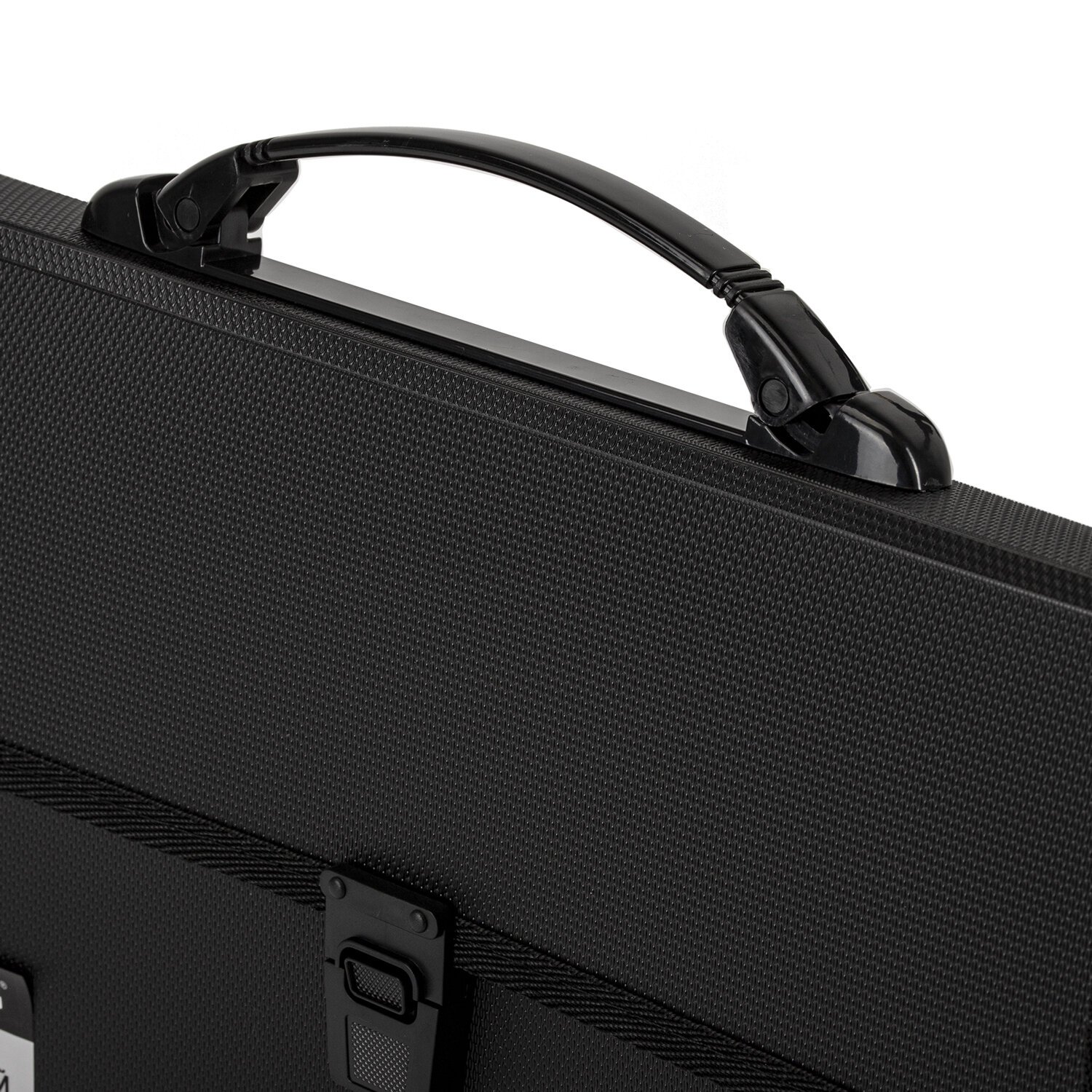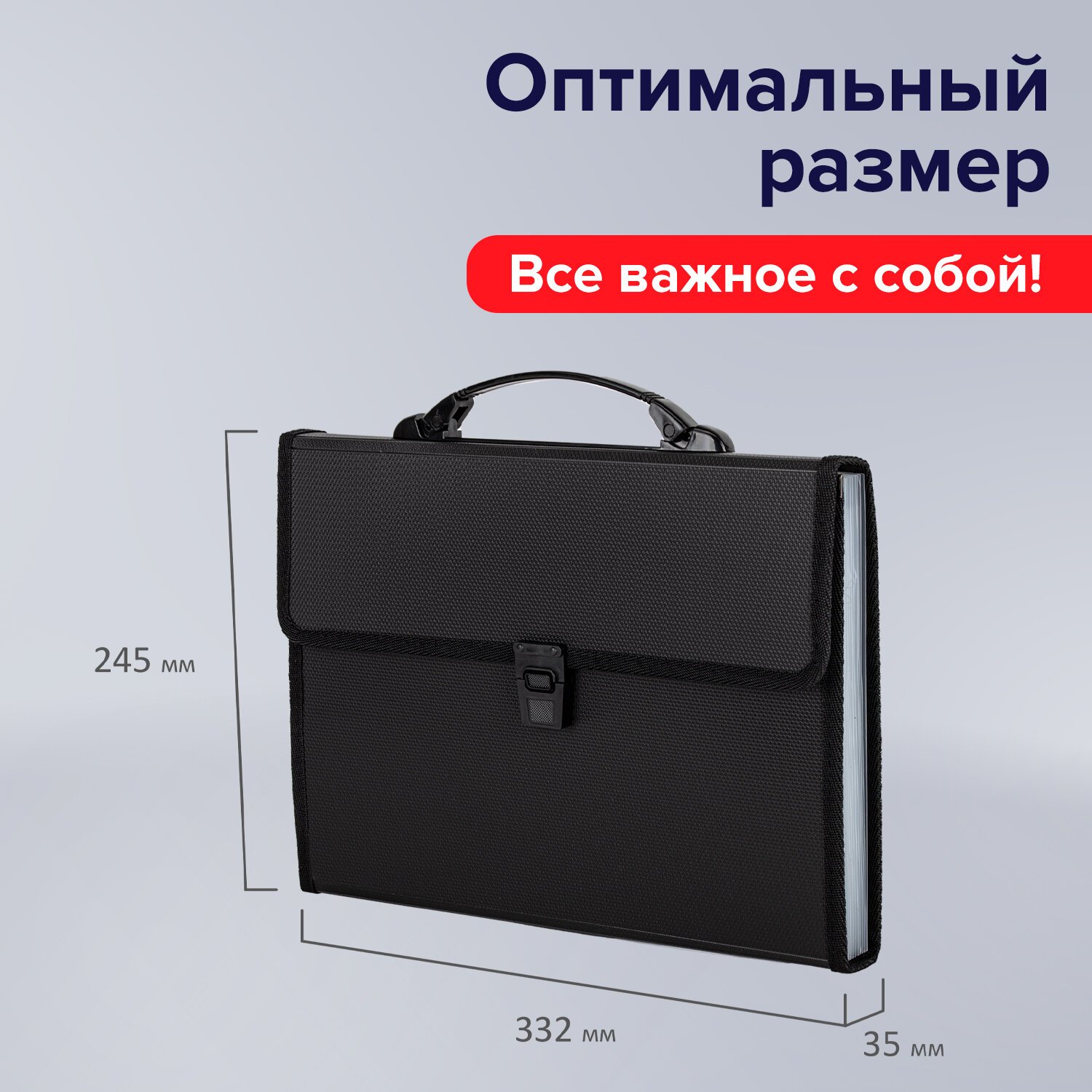 Портфель формата А4 (332х245х35 мм) изготовлен из плотного пластика толщиной 1 мм, выполнен в солидном черном цвете с фактурой "циновка" и имеет 13 отделений с индексными ярлыками. Складная ручка обеспечивает компактность изделия. Портфель застегивается на клапан. Края окантованы тканью с металлическими рейками по краям окантовки, что придает изделию презентабельный вид.