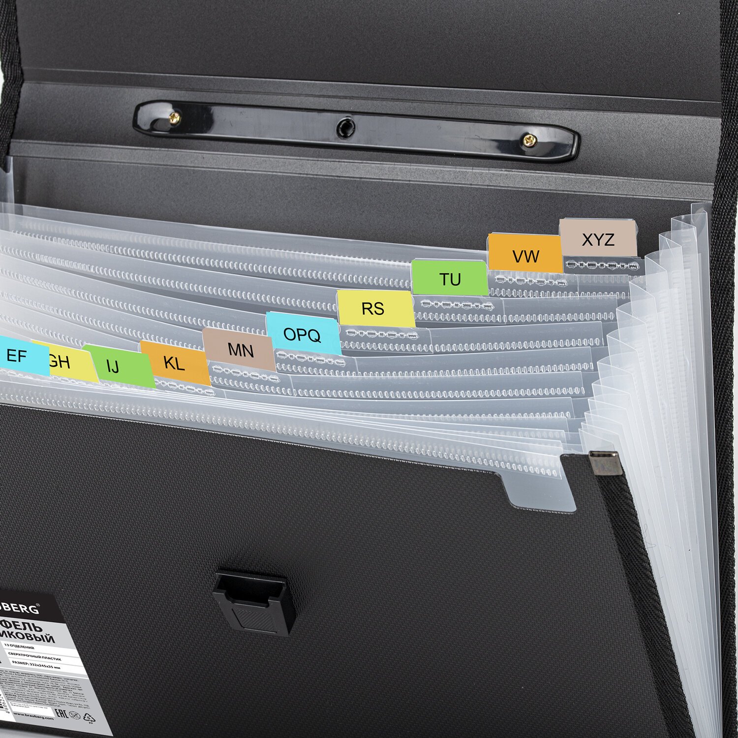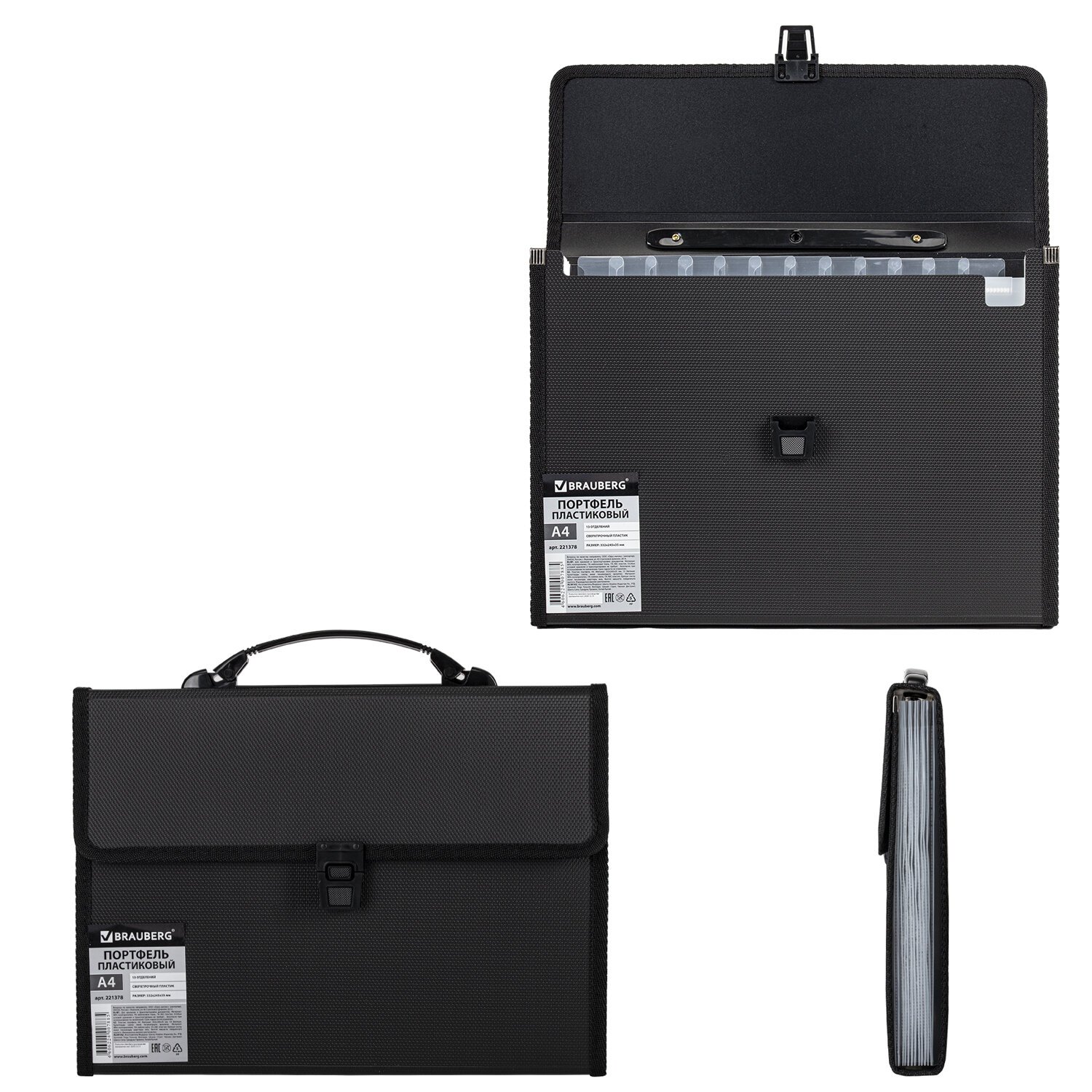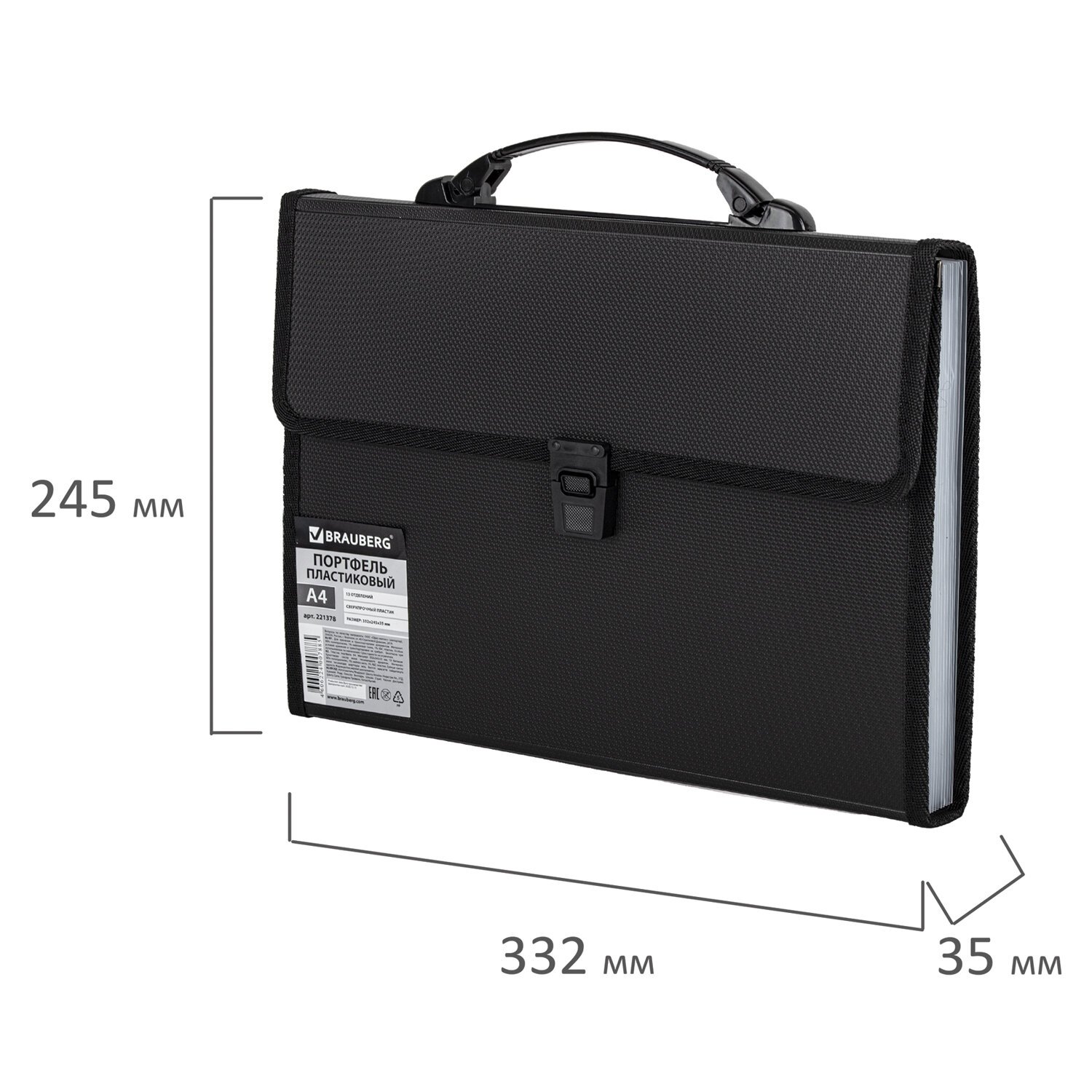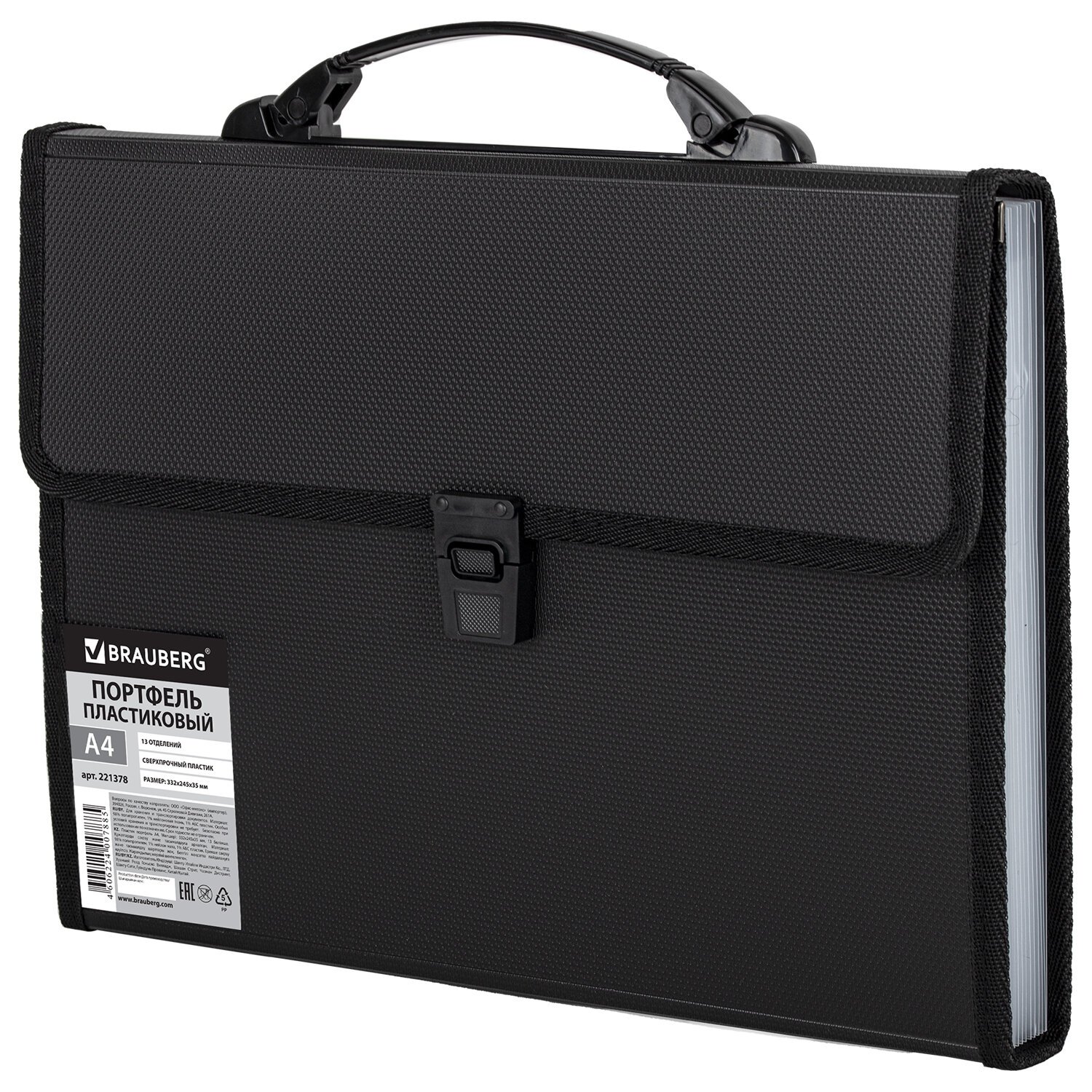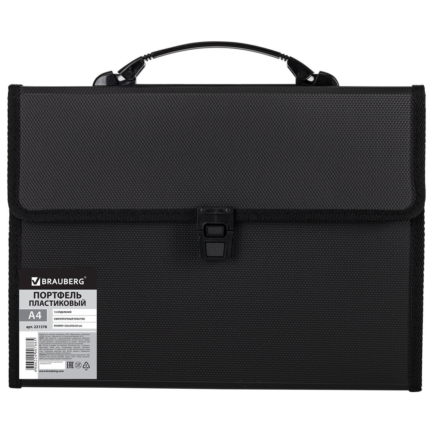 Папка-портфель пластиковая BRAUBERG А4 (332х245х35 мм), 13 отделений, фактура диагональ, черная, 221375