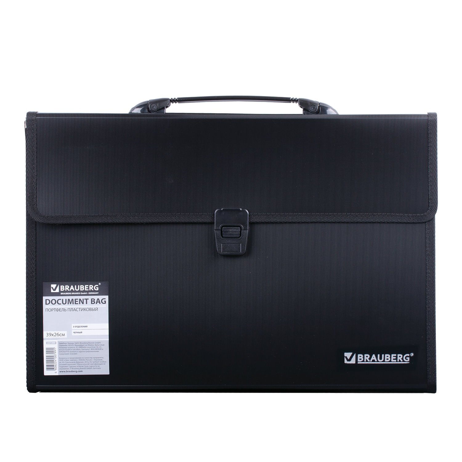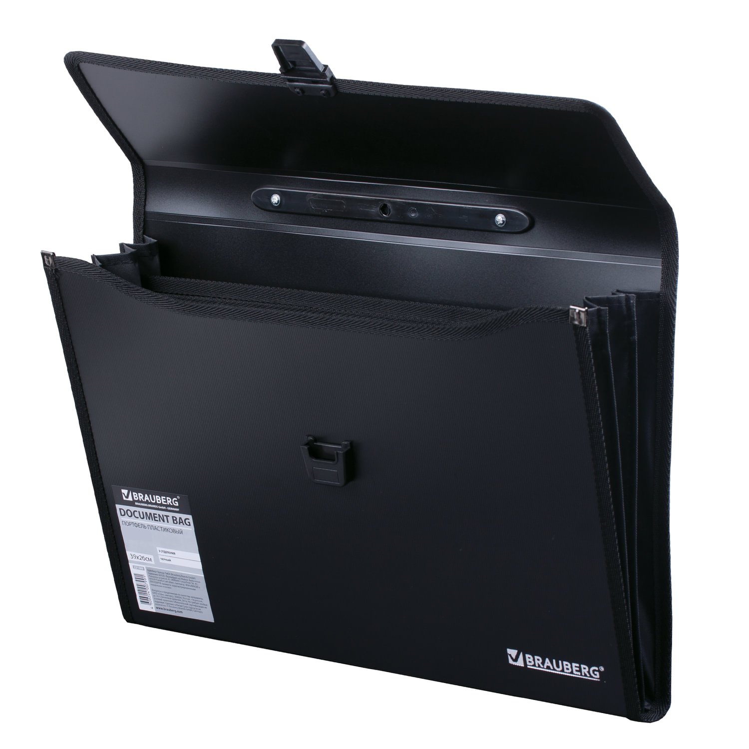 Папка-портфель пластиковая BRAUBERG А4+ (390х260х40 мм), 3 отделения, фактура линейная, черная, 221389