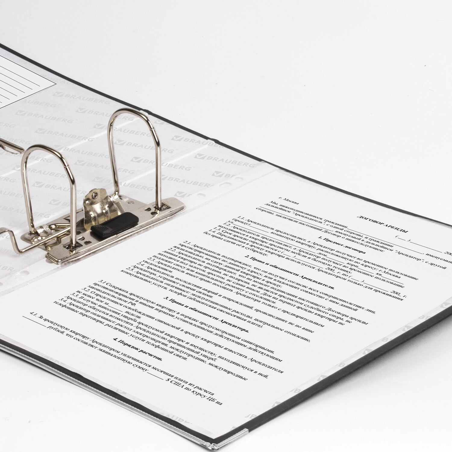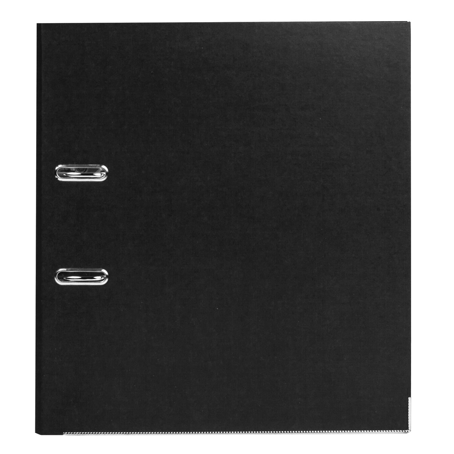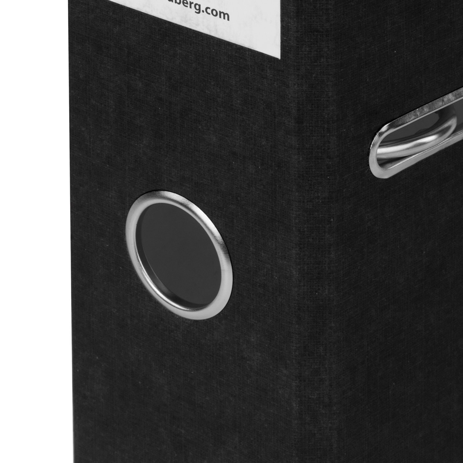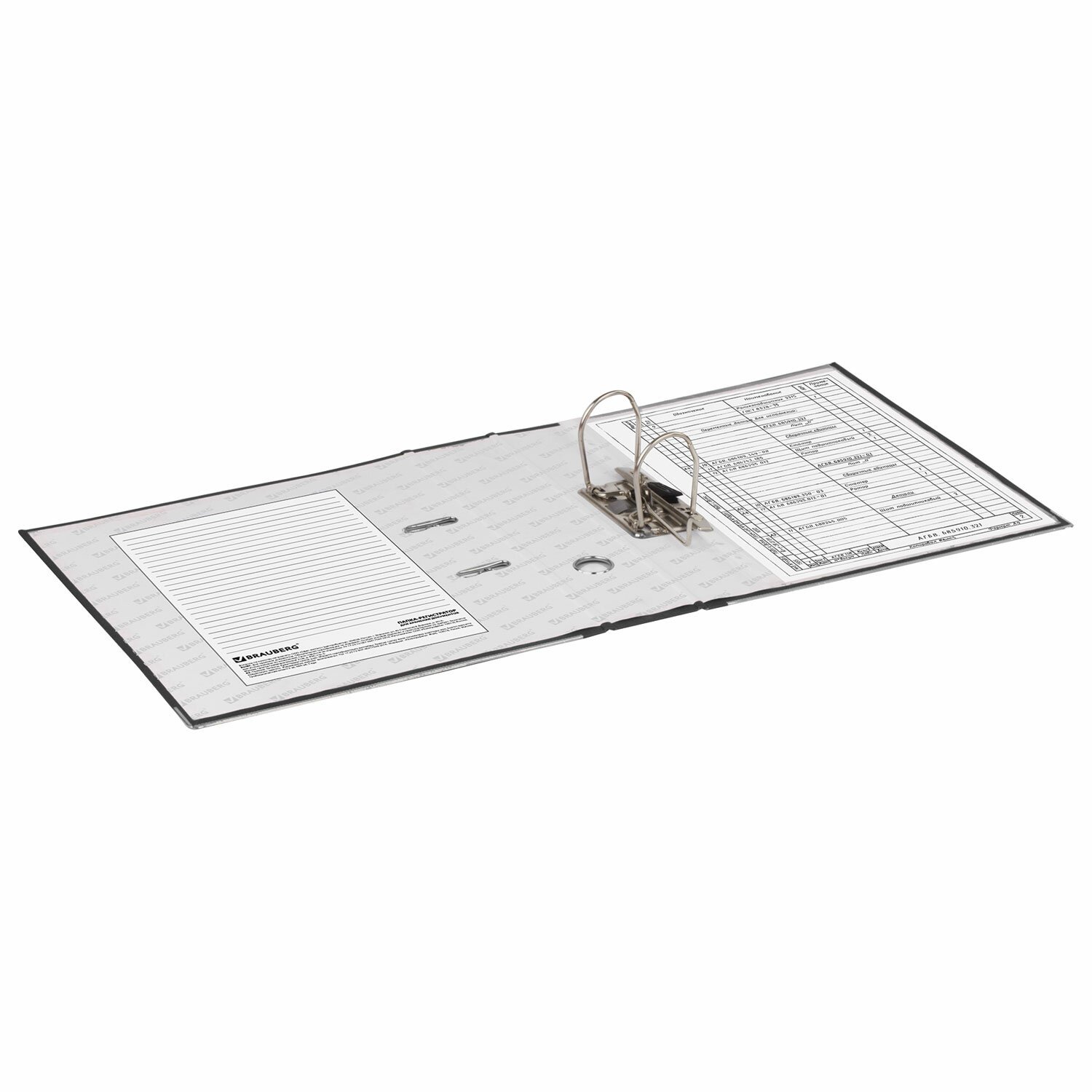 Папка формата А4 с вертикальной ориентацией изготовлена из высококачественного износоустойчивого картона с черным покрытием. Ширина корешка в 75 мм позволяет разместить до 500 листов. Нижние края папки защищены металлическими уголками, что увеличивает срок службы в 2 раза. Прорези для колец на внешней крышке позволяют оставаться папке закрытой даже при большом количестве бумаг, а надежный арочный механизм легко справляется с ежедневными нагрузками. Корешок снабжен этикеткой для маркировки содержимого, что позволяет структурировать информацию.