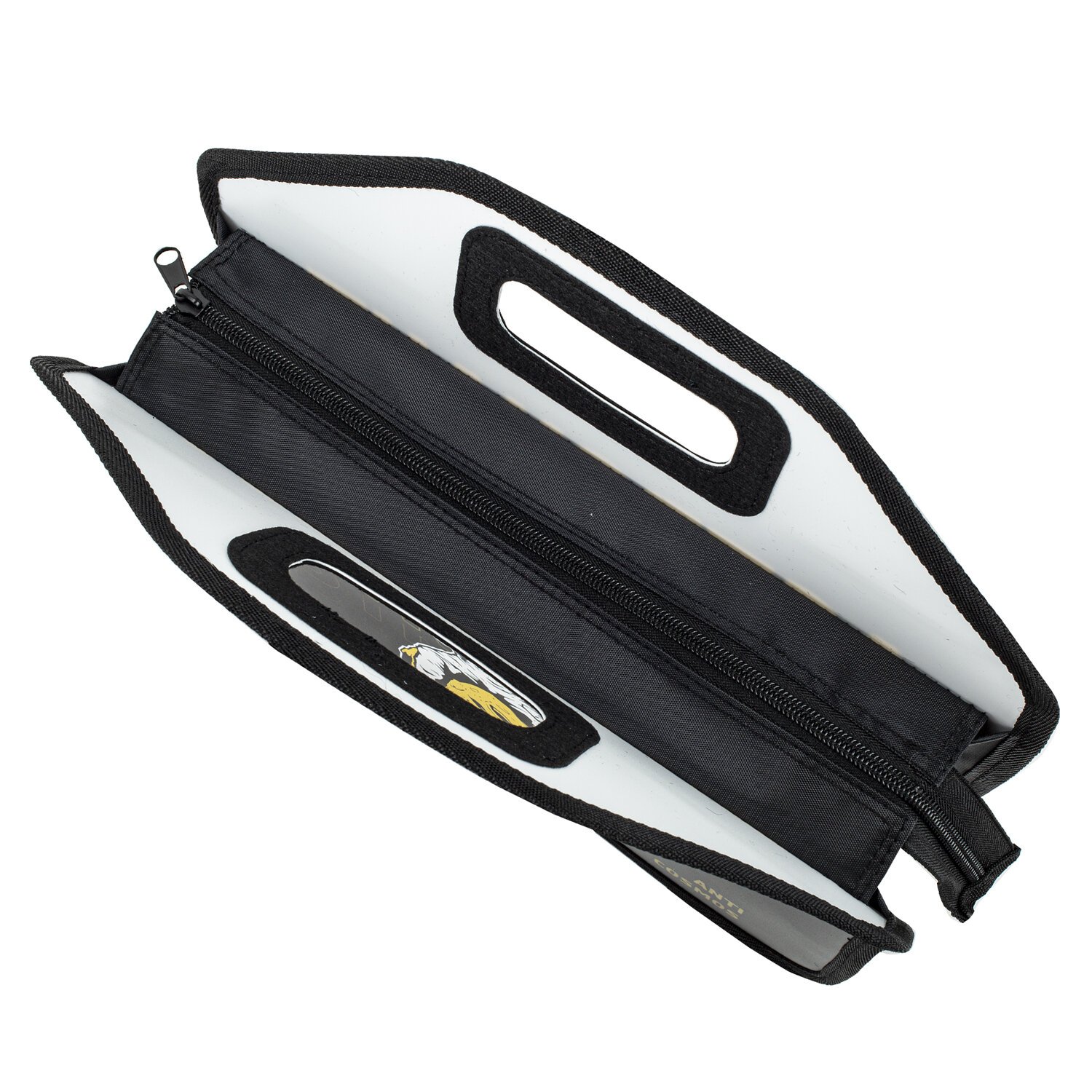 Папка-сумка на молнии с ручками ЮНЛАНДИЯ выполнена из пластика, по краям имеет тканевую окантовку, уплотненные фетром двойные ручки в корпусе папки. Застежка-молния расположена по верхнему краю папки.