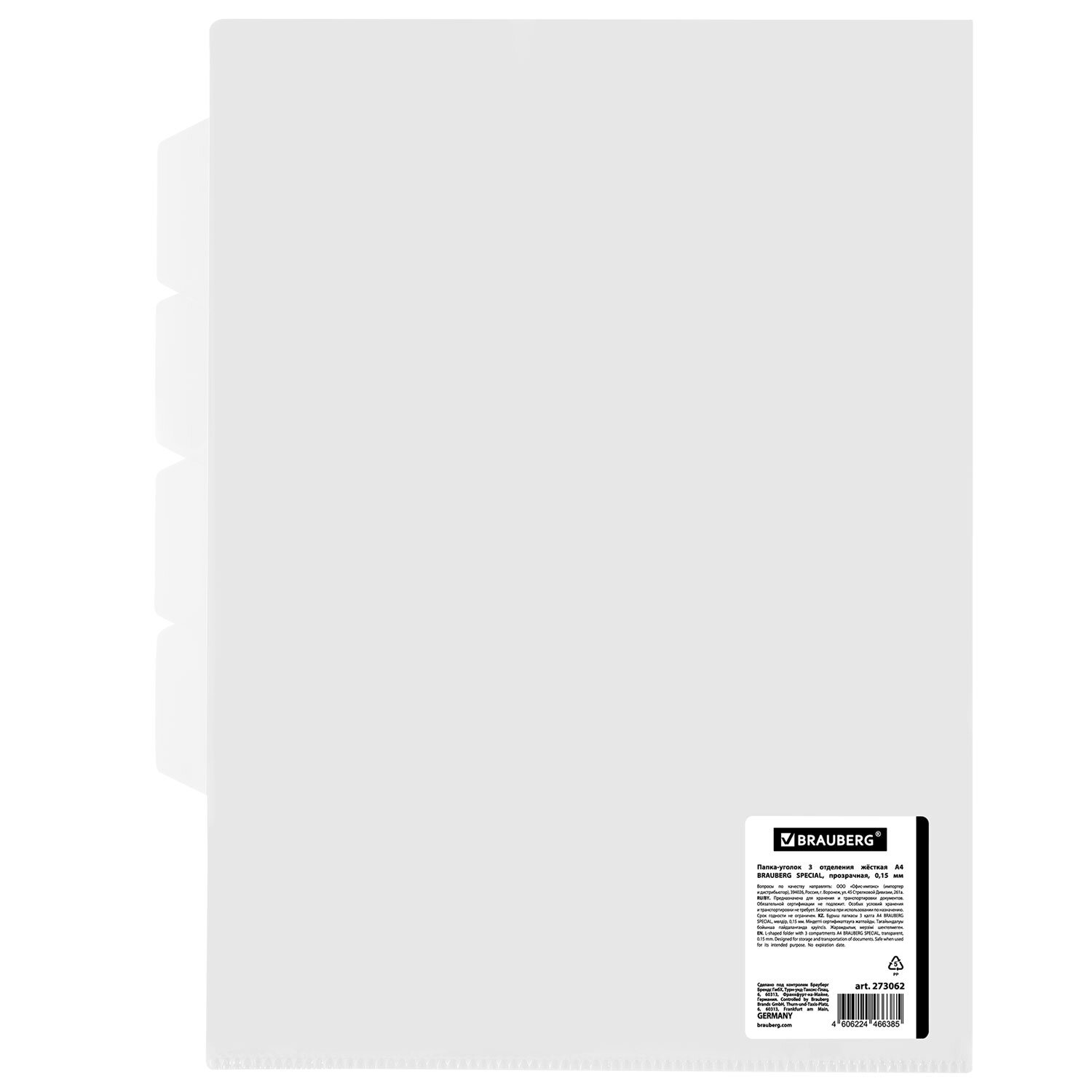 Папка-уголок 3 отделения жесткая А4 BRAUBERG SPECIAL, прозрачная, 0,15 мм, 273062