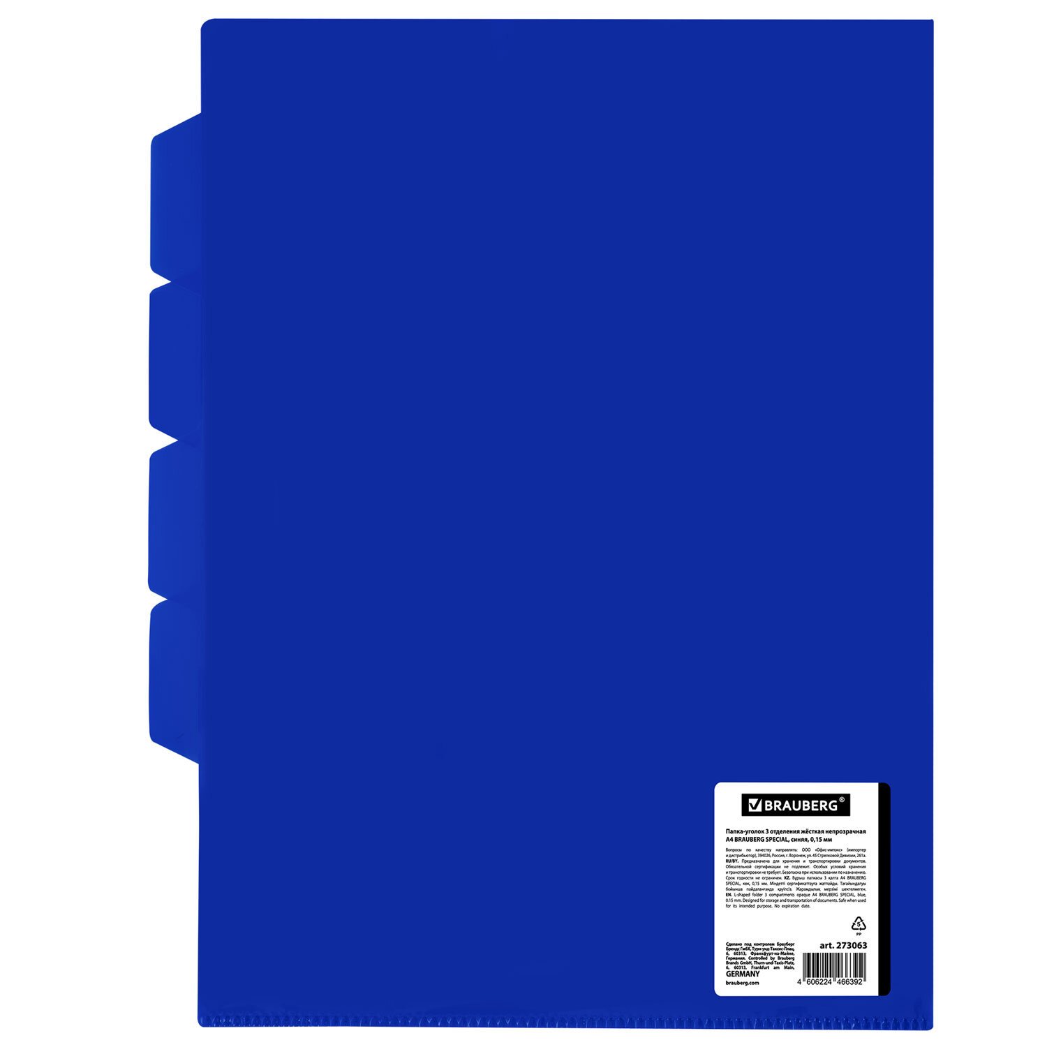 Папка-уголок 3 отделения жесткая непрозрачная А4 BRAUBERG SPECIAL, синяя, 0,15 мм, 273063