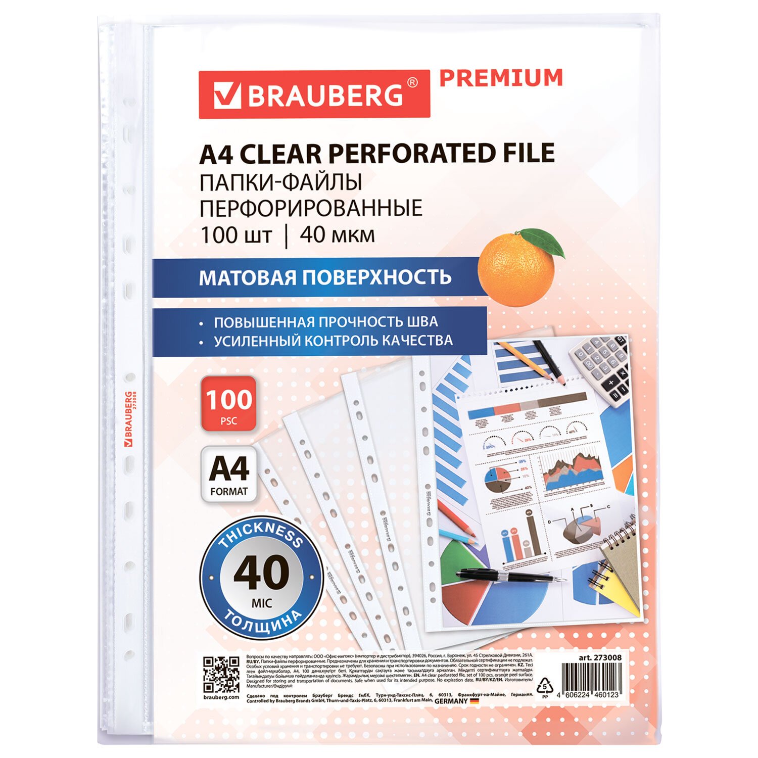 Папки-файлы перфорированные А4 BRAUBERG "PREMIUM", КОМПЛЕКТ 100 шт., матовые, 40 мкм, 273008
