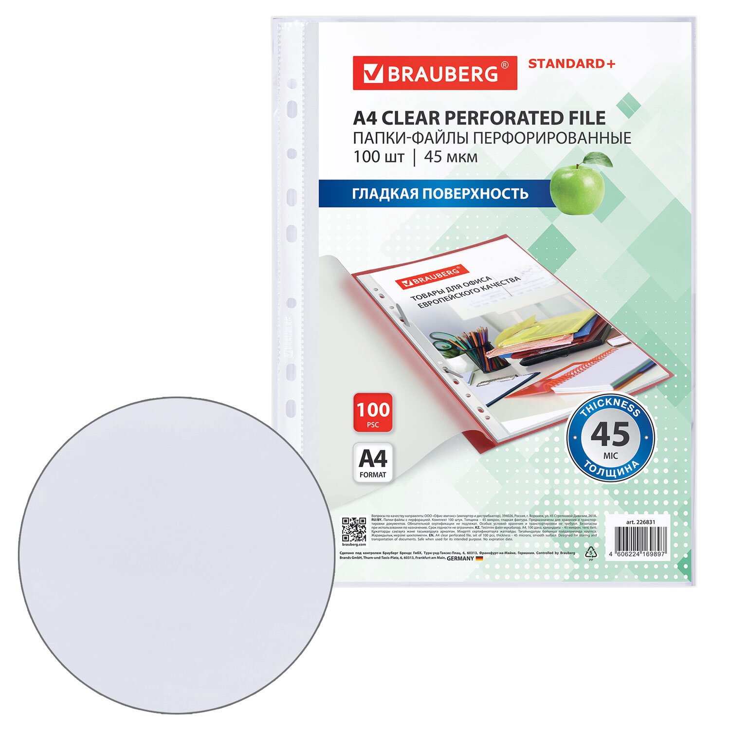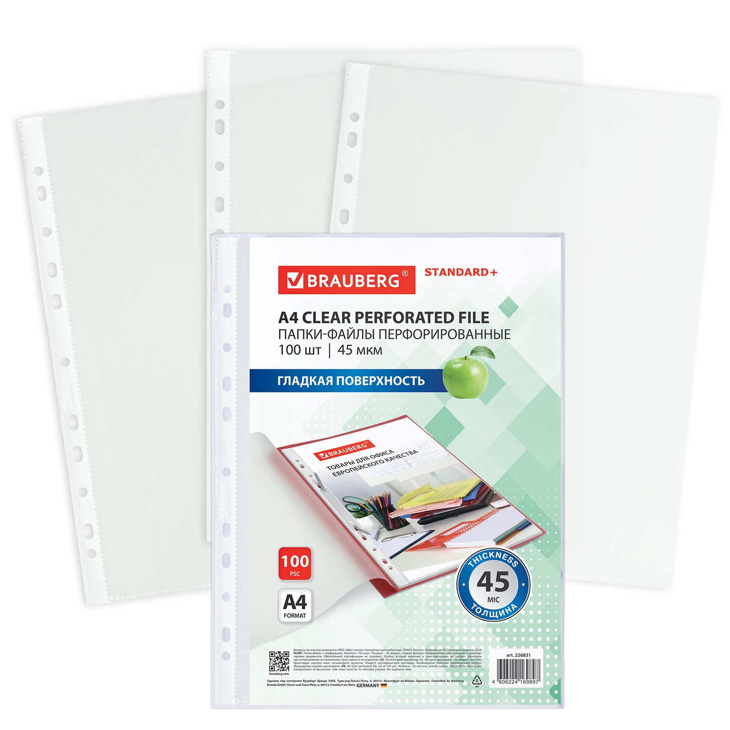 Папки-файлы перфорированные, А4, BRAUBERG "STANDARD", комплект 100 шт., гладкие, 45 мкм, 226831