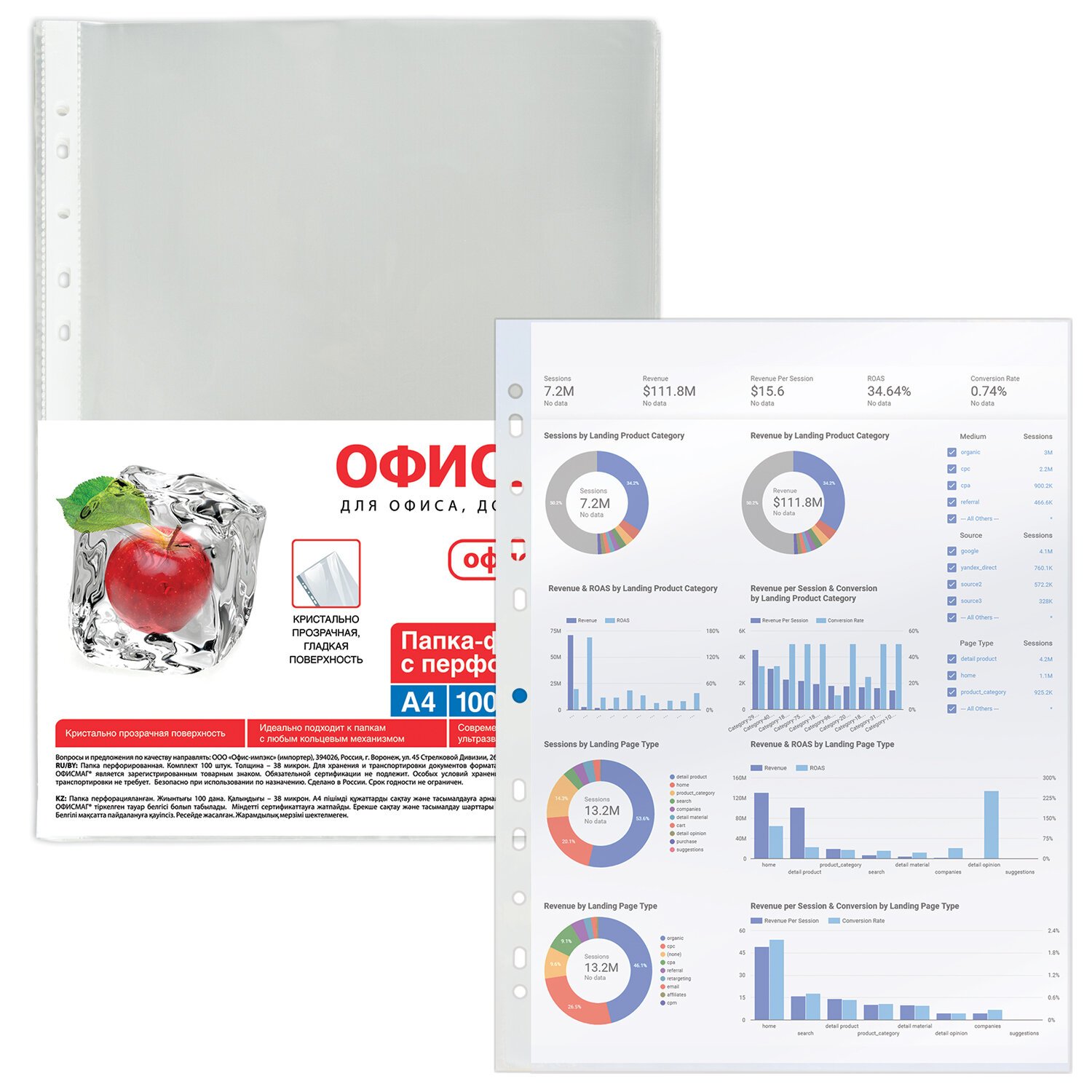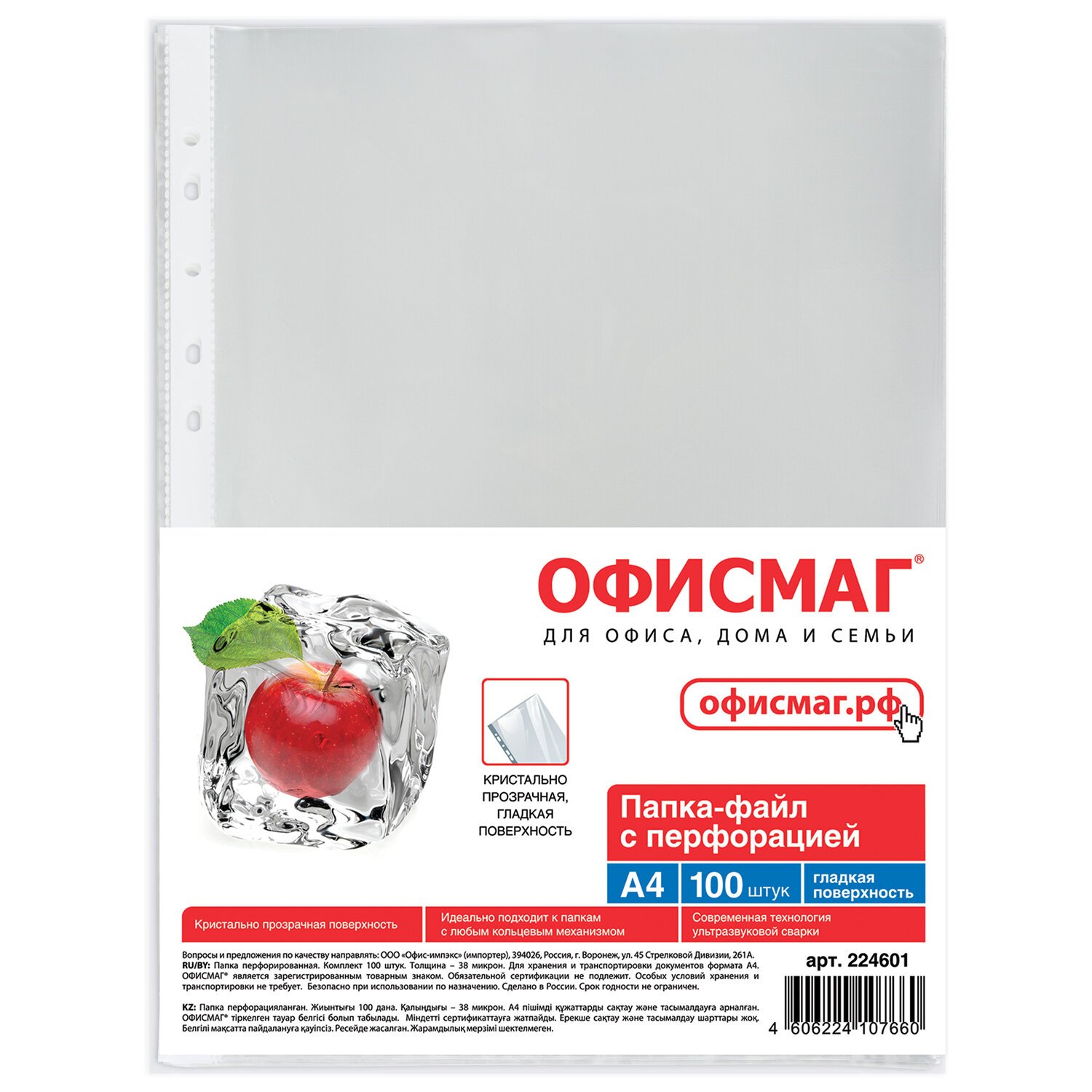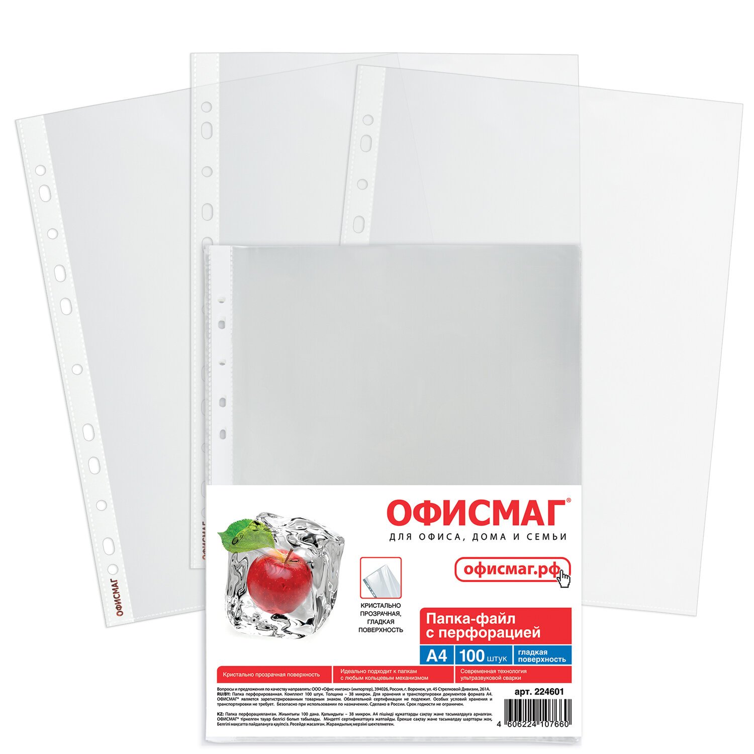 Папки-файлы перфорированные, А4, ОФИСМАГ "ПРЕМИУМ", комплект 100 шт., гладкие, 38 мкм, 224601