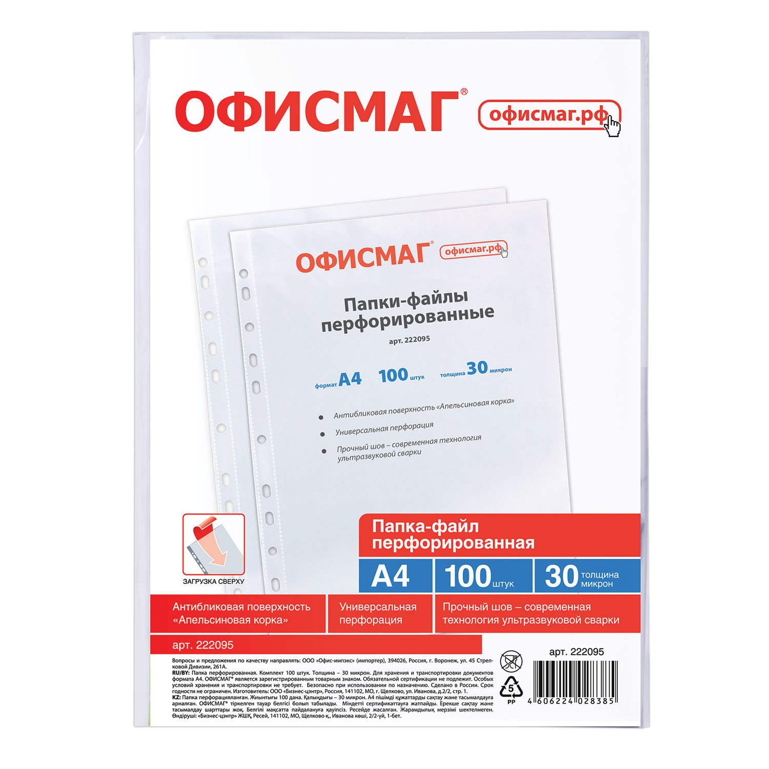 Перфопапки формата А4 с вертикальным размещением содержат универсальную перфорацию, а также имеют фактуру "апельсиновая корка" и прочные швы. Толщина пленки – 30 мкм, что подходит для хранения до 20 листов в 1 папке-файле. В комплекте 100 шт.