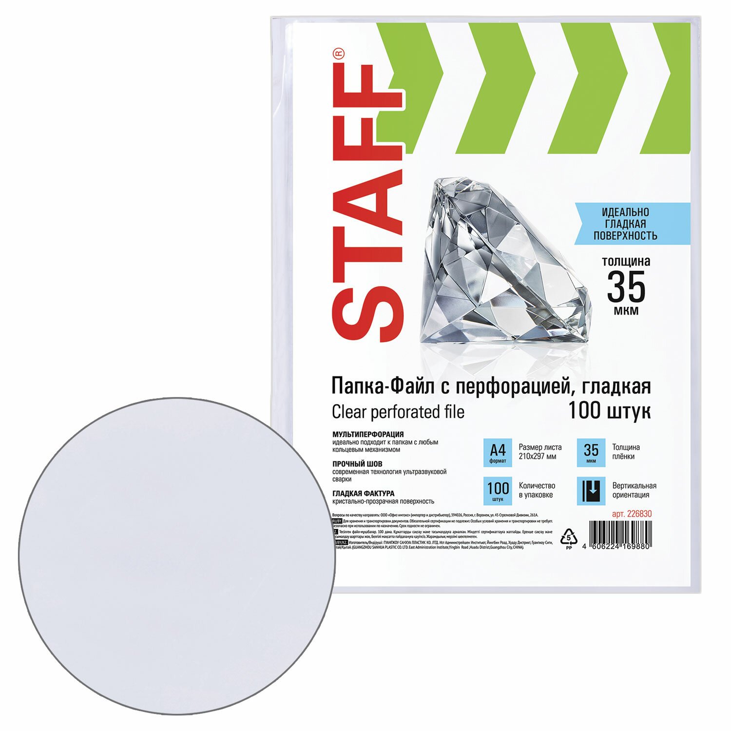 Папки-файлы перфорированные, А4, STAFF "ЭКОНОМ", КОМПЛЕКТ 100 шт., гладкие, 35 мкм, 226830