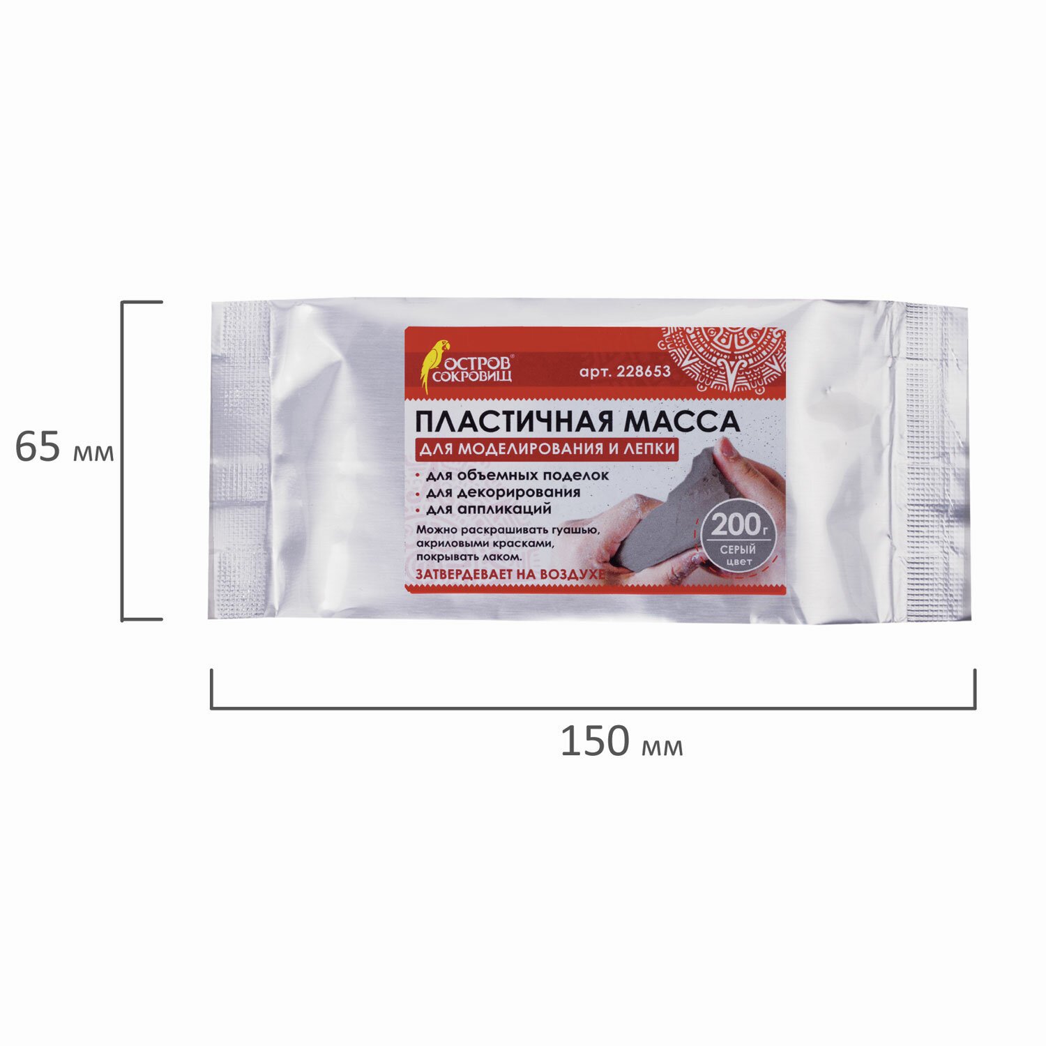 Масса для лепки ОСТРОВ СОКРОВИЩ серого цвета фасовкой 200 грамм упакована в герметичную фольгированную упаковку, что позволяет хранить товар в течение длительного времени. Масса очень податлива: моделируется руками, пластична, легко лепится, раскатывается, режется, принимает любую форму. При необходимости можно использовать инструменты. Чтобы избежать появление трещин на изделии после застывания, необходимо работать с массой влажными руками. Затвердевает на воздухе, после высыхания становится очень прочной, не усаживается.