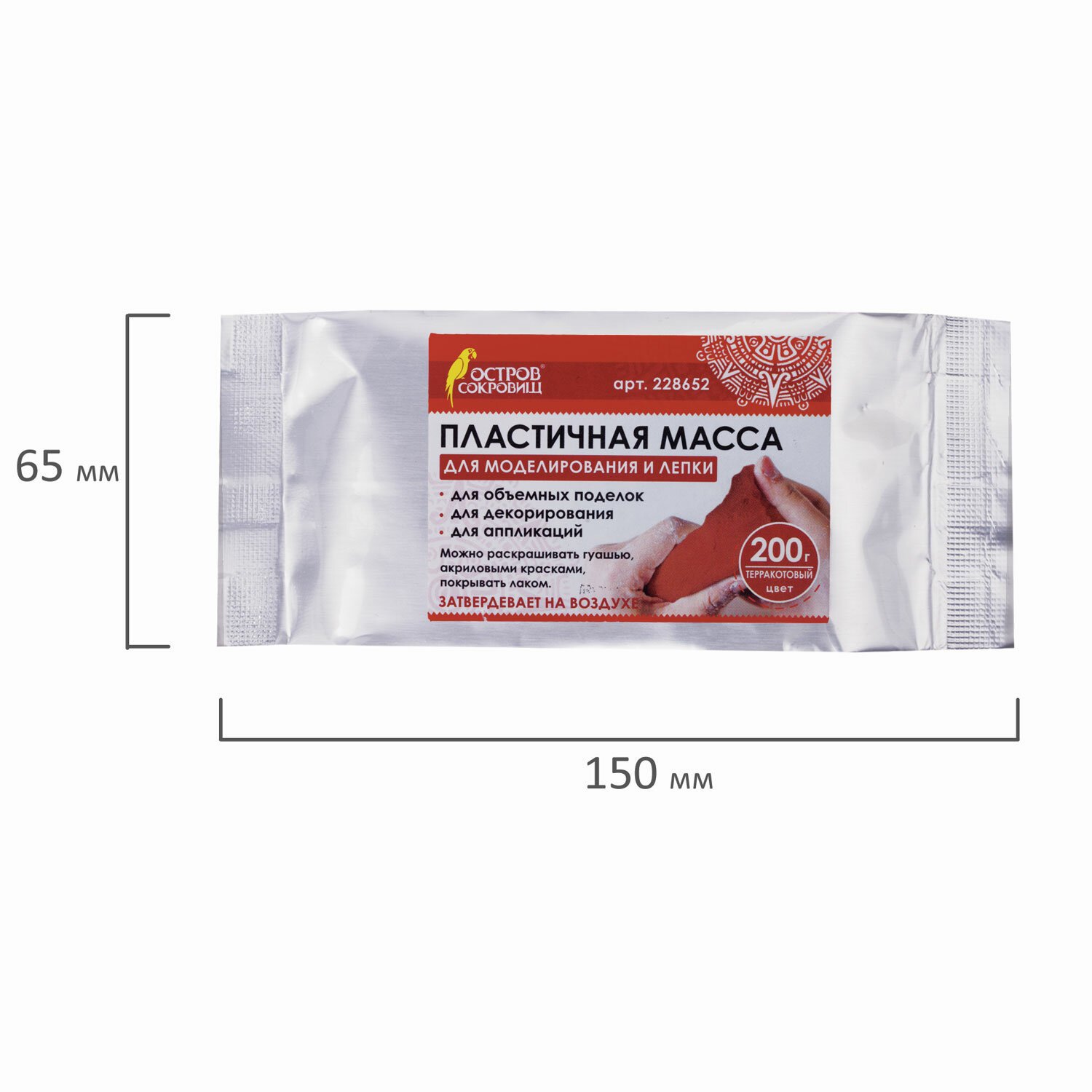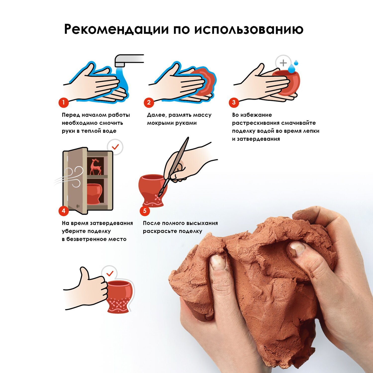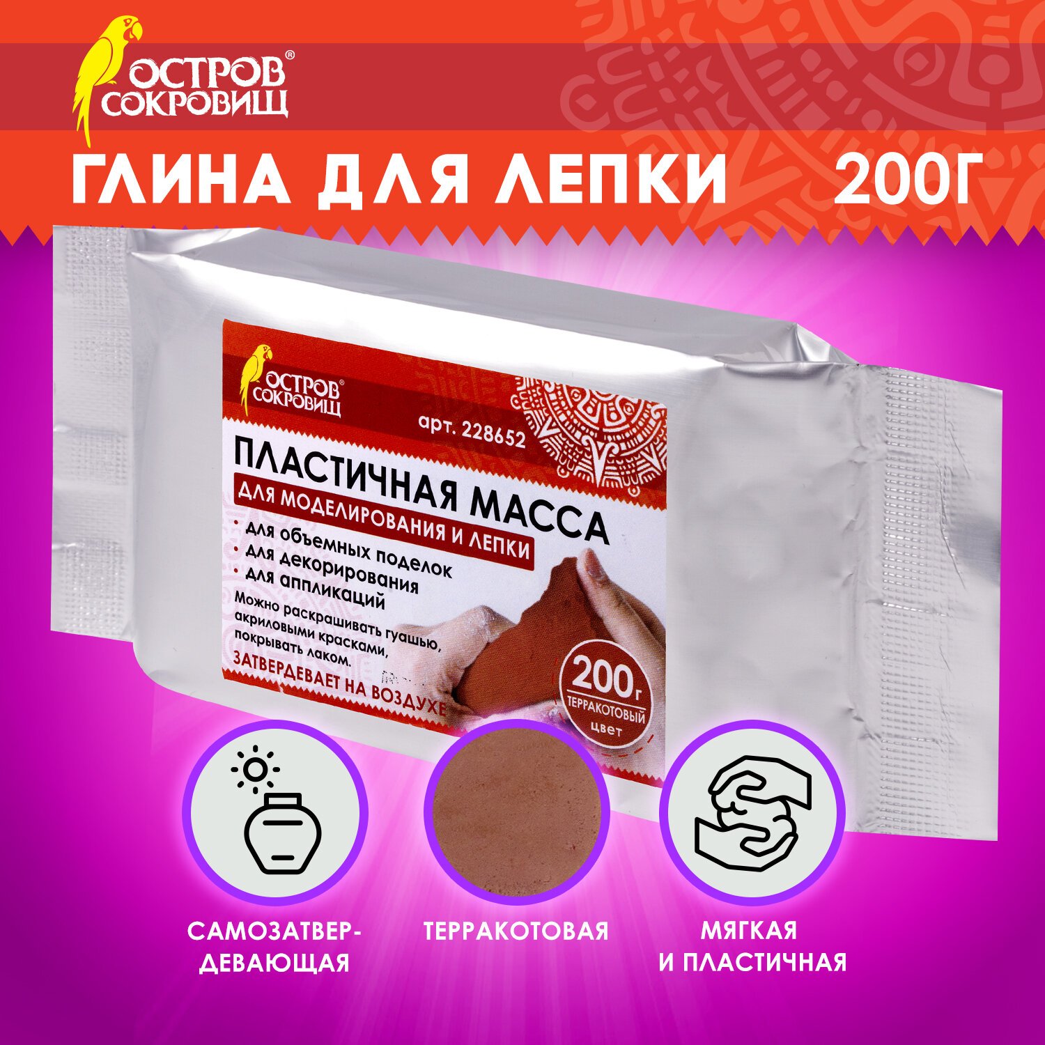 Масса для лепки ОСТРОВ СОКРОВИЩ терракотового цвета фасовкой 200 г упакована в герметичную фольгированную упаковку, что позволяет хранить товар в течение длительного времени. Масса очень податлива: моделируется руками, пластична, легко лепится, раскатывается, режется, принимает любую форму. При необходимости можно использовать инструменты. Чтобы избежать появление трещин на изделии после застывания, необходимо работать с массой влажными руками. Затвердевает на воздухе, после высыхания становится очень прочной, не усаживается.