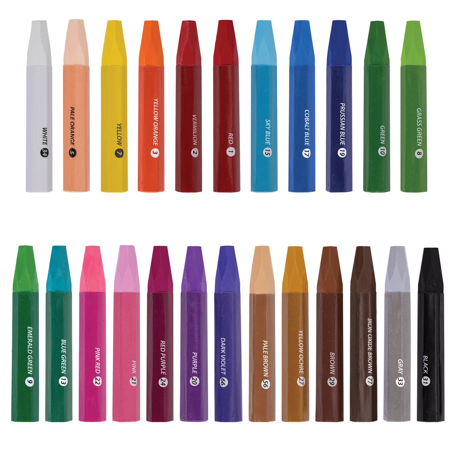 Палитра состоит из 25 ярких и насыщенных цветов, в комплекте держатель и точилка для мелка. Полностью безопасны в использовании, не токсичны и не имеют резкого запаха. Благодаря своему составу мелки пишут мягко и ярко. Утолщенная шестигранная форма корпуса и диаметр 11 мм делают их еще более удобными для тренировки руки.