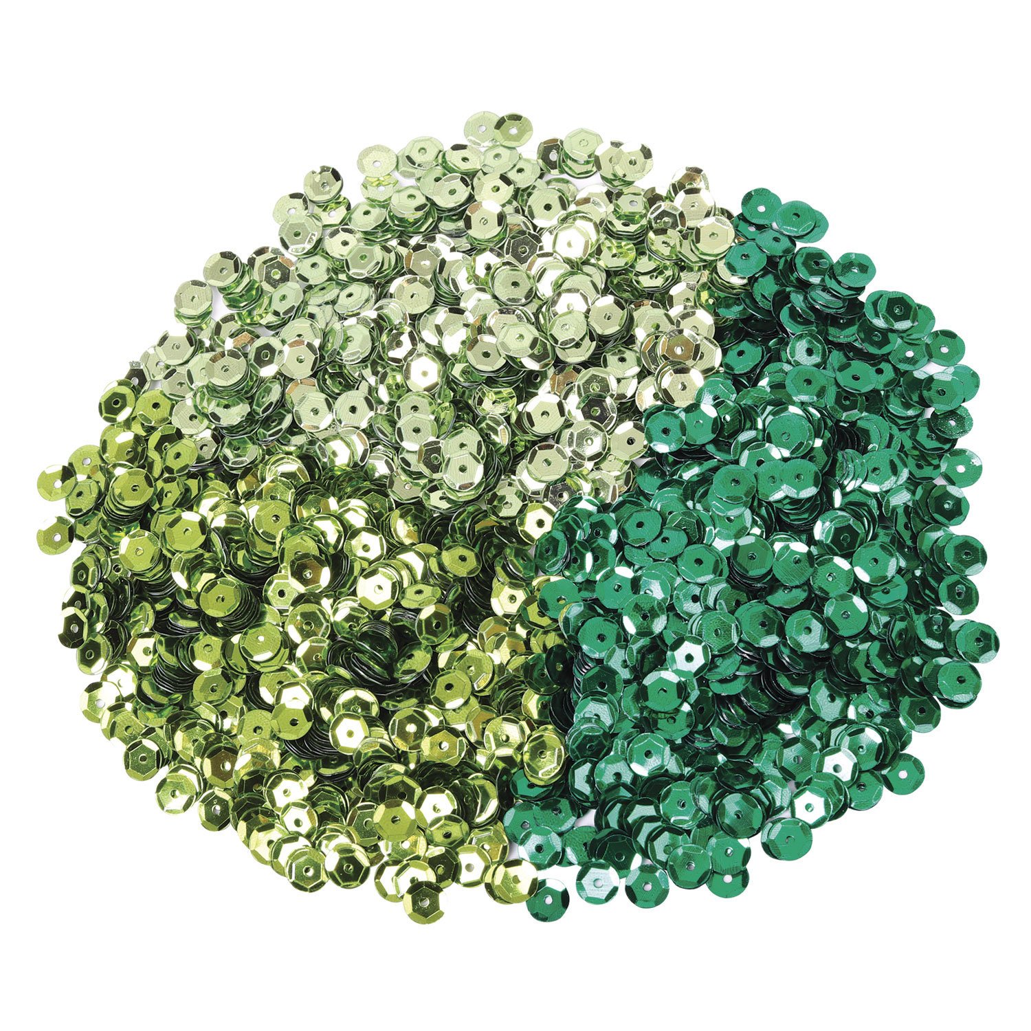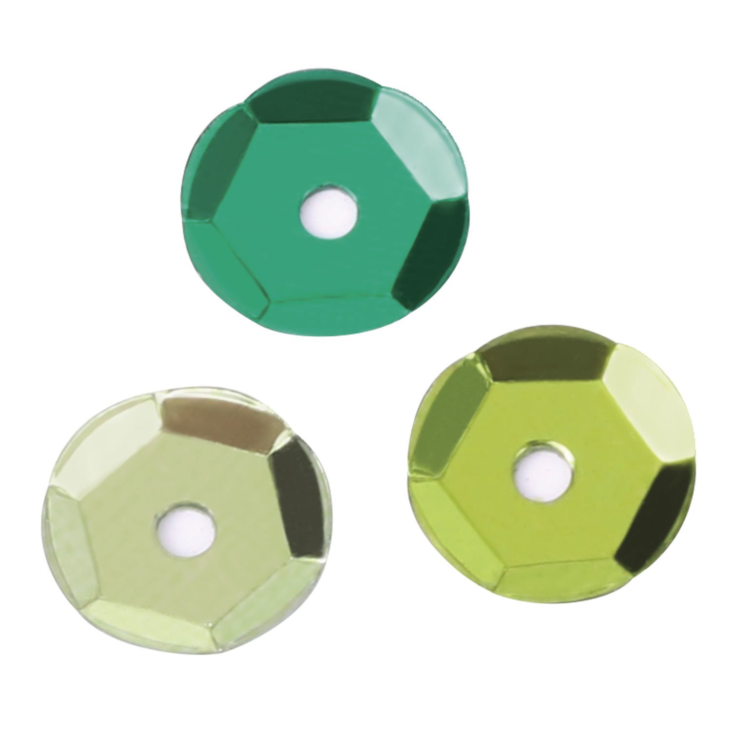 Изготовлены из высококачественного пластика. Представлены 3 оттенка зеленого с фольгированным эффектом. Пайетки классической круглой формы с шестигранной огранкой. Оснащены отверстием для нити в центре. Предназначены для детей от 3 лет. Диаметр - 6 мм. Вес - 30 г. Поставляются в пакете с европодвесом.