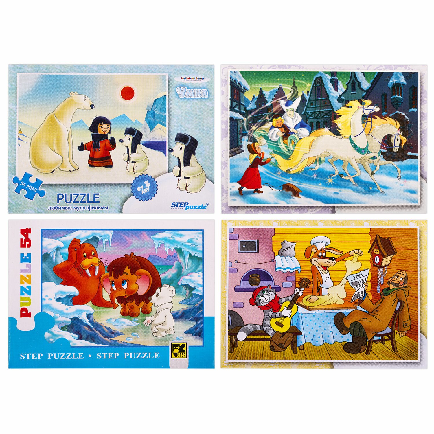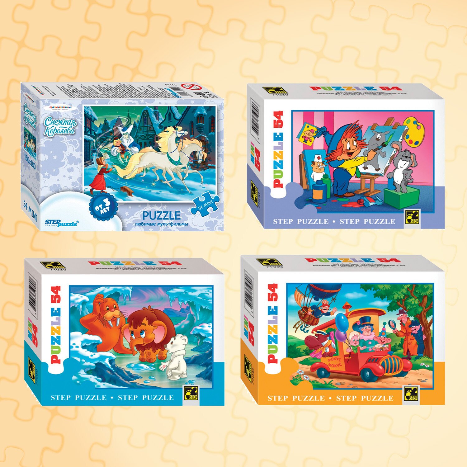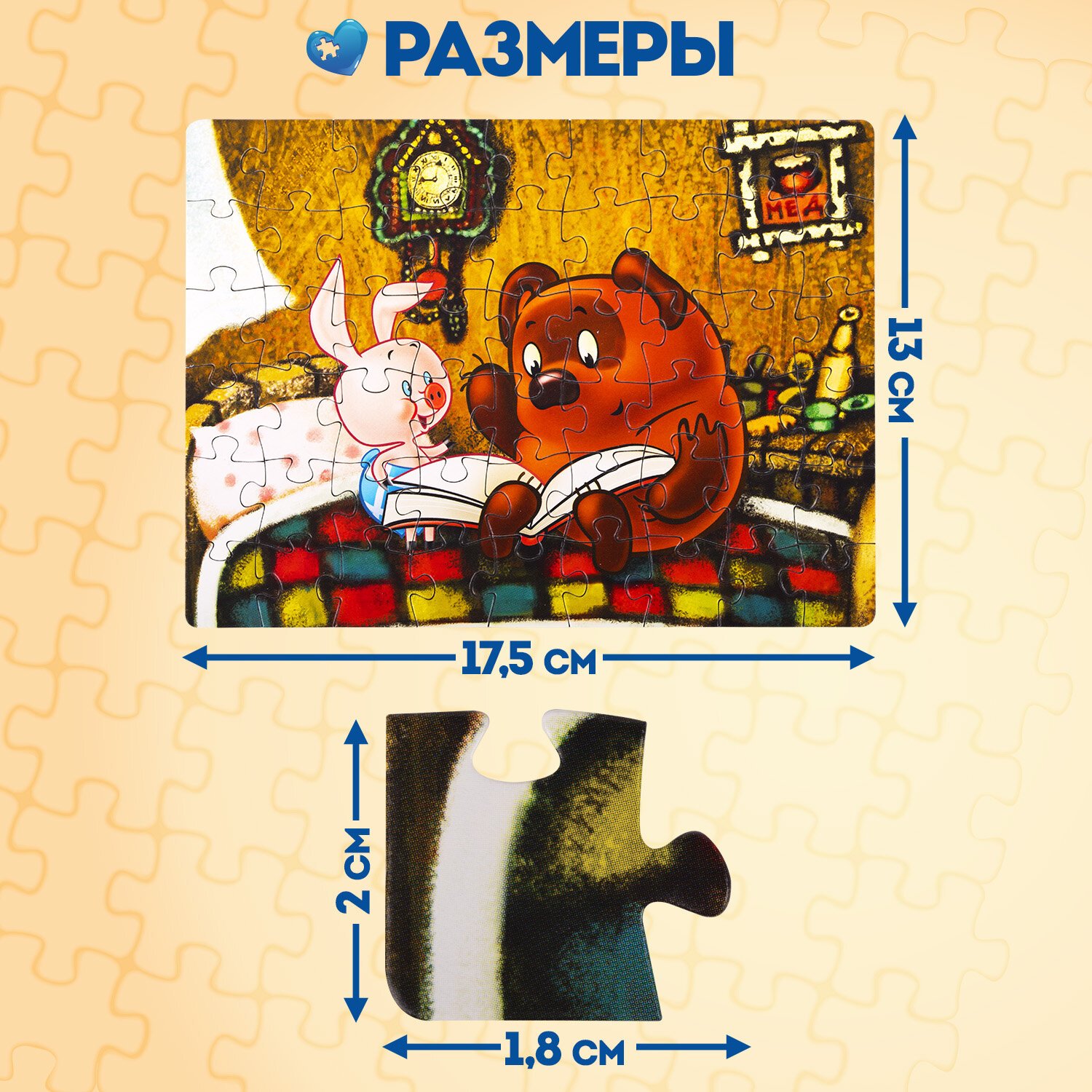 Комплект пазл состоит из 54 элементов, размер детали пазла – 2х1,8 см. Детали изготовлены из экологически безопасного и не расслаивающегося картона. Предназначен для самых маленьких, отлично помогает в формировании мелкой моторики ребёнка. Дизайны созданы художниками-мультипликаторами. Сюжет и персонажи картинки яркие и интересные, хорошо прорисованные.