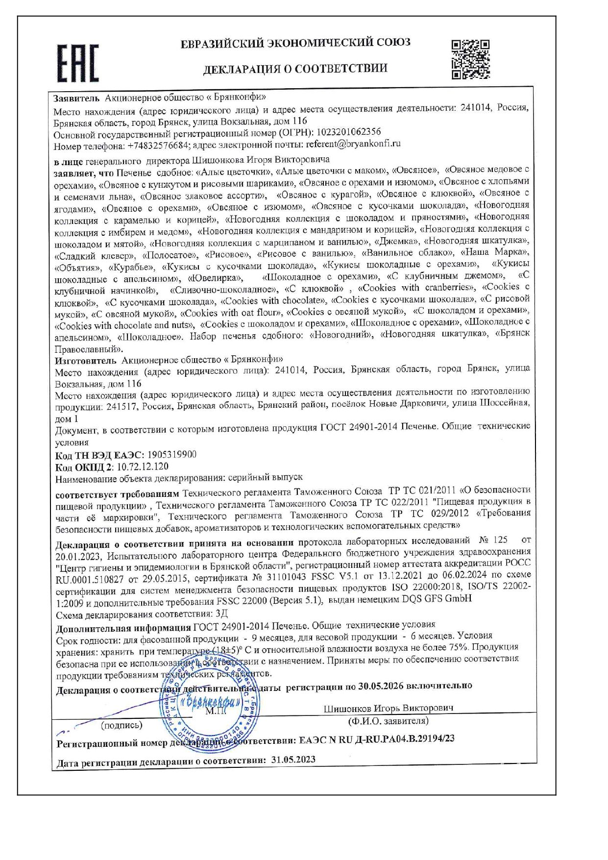 Состав: мука пшеничная, маргарин (рафинированные дезодорированные растительные масла в натуральном модифицированном виде, вода питьевая, эмульгаторы (Е471, Е475), соль, ароматизатор «Сливки-молоко», краситель «Каротины», регулятор кислотности (лимонная кислота); сахар, глазурь кондитерская (сахар, заменитель масла какао (масло растительное, эмульгаторы (соевый лецитин, Е492), какао-порошок, эмульгаторы (лецитин соевый, Е476), ароматизатор «Ванилин»); ядро арахиса дробленое; вода питьевая; какао-порошок; инвертный сироп (сахар, регуляторы кислотности: гидрокарбонат натрия (сада пищевая), лимонная кислота); сыворотка молочная сухая; ядро ореха фундука дробленое; шоколадная масса (сахар, тертое какао, масло какао, эмульгатор лецитин соевый, разрыхлители: карбонат аммония, гидрокарбонат натрия (сода пищевая); соль эмульгатор лецитин соевый; ароматизатор« Шоколад».