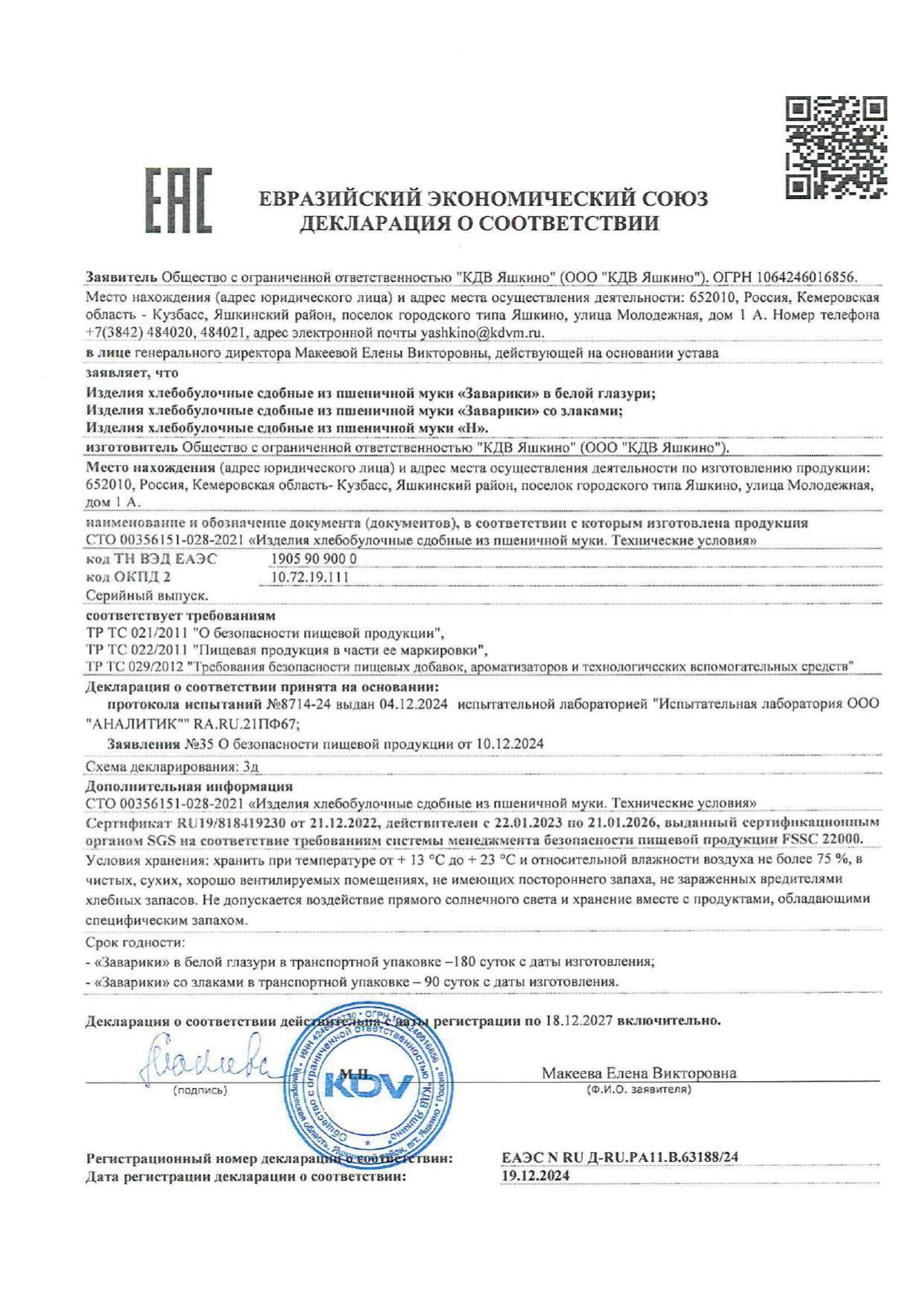 Состав: мука пшеничная хлебопекарная в/с, яйца куриные пищевые, вода питьевая, жир кондитерский (рафинированные дезодорированные растительные масла в натуральном и модифицированном виде, эмульгатор, моно- и диглицериды жирных кислот, антиокислители: аскорбиновая кислота, альфа-токоферол), глазурь белая (сахар, заменитель масла какао лауринового типа (рафинированное, дезодорированое пальмоядровое масло, эмульгатор сорбитан тристеарат), сыворотка молочная сухая, эмульгаторы: соевый лецитин, Е476, ароматизатор), сахар-песок, соль пищевая, разрыхлители: Е450, гидрокарбонат натрия, регулятор кислотности Е541, антислеживающий агент Е536, дрожжи хлебопекарные прессованные.