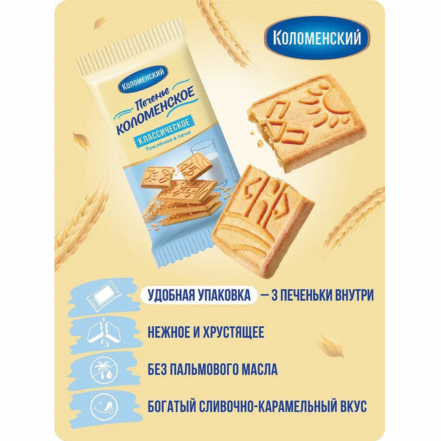 Печенье классическое КОЛОМЕНСКОЕ обладает нежным сливочно-карамельным вкусом. Выпекается по особой технологии обладает особой текстурой – печенье буквально тает во рту!