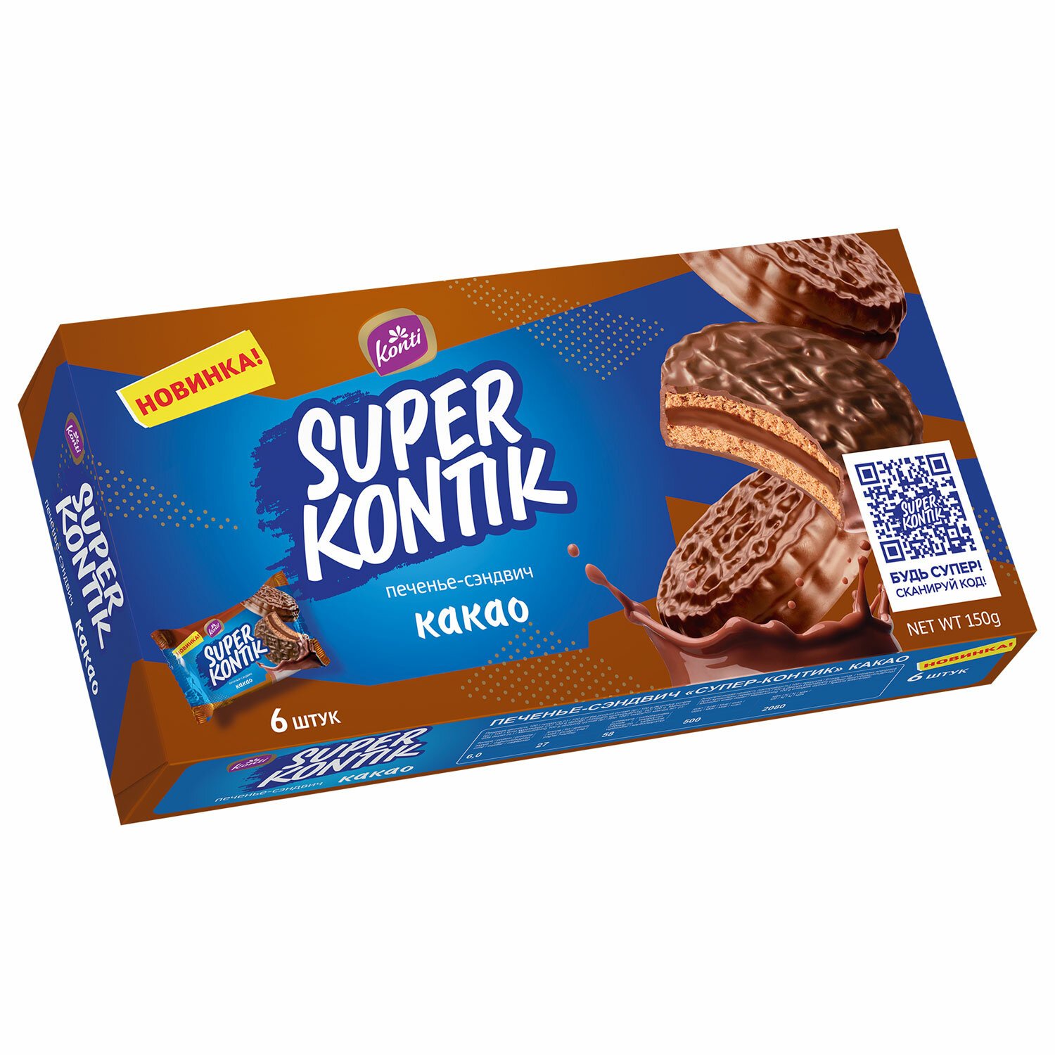 KONTI "Супер-Контик" – это два печенья, соединенные нежной начинкой шоколадного цвета с какао в глазури.