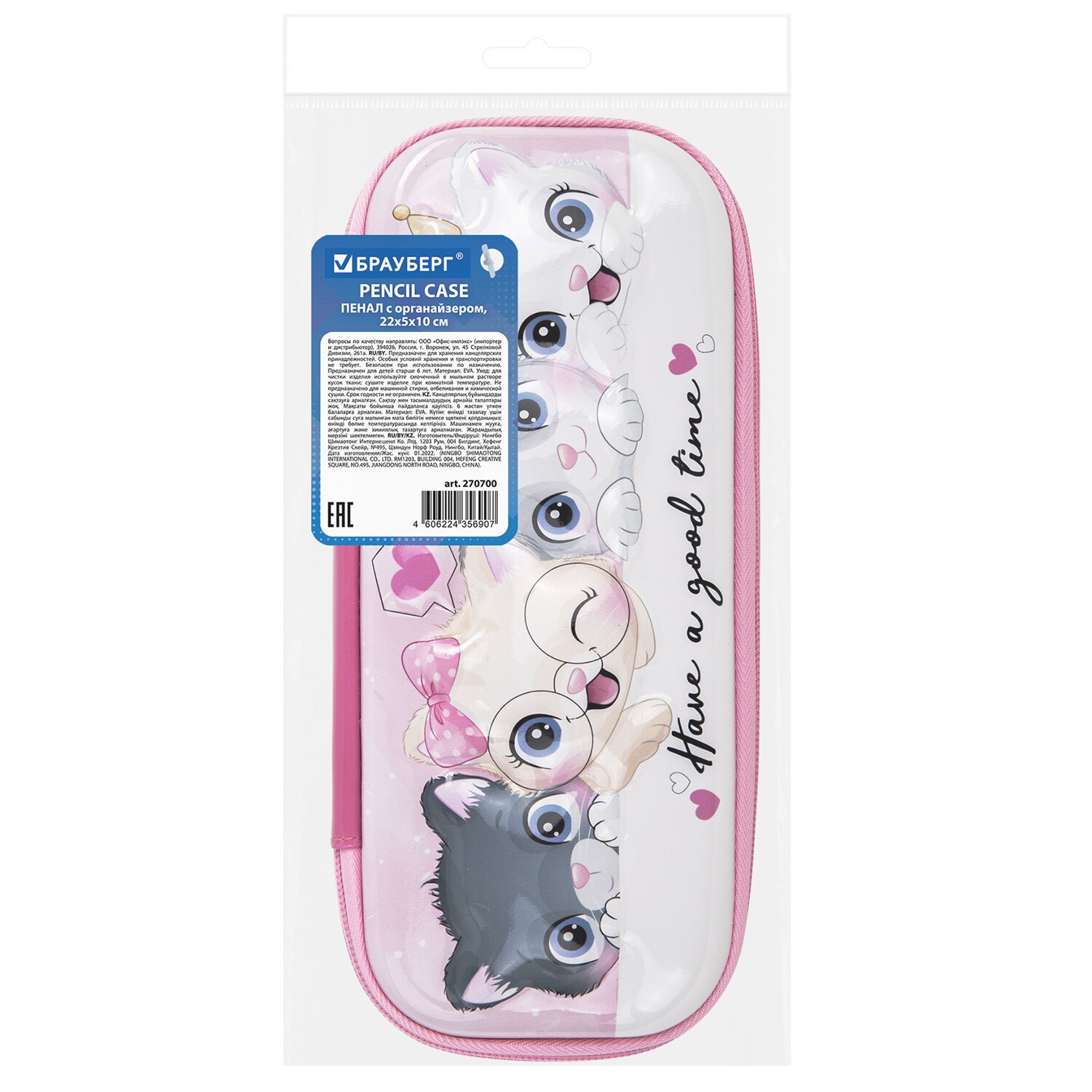 Пенал BRAUBERG, 1 отделение, 1 откидная планка, EVA 3D, 22х10х5 см, "Cats", 270700