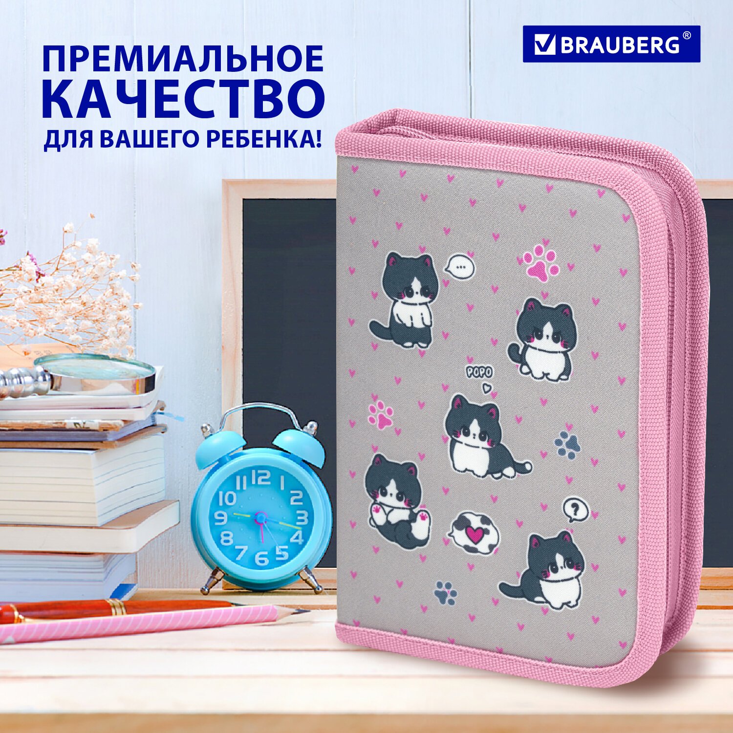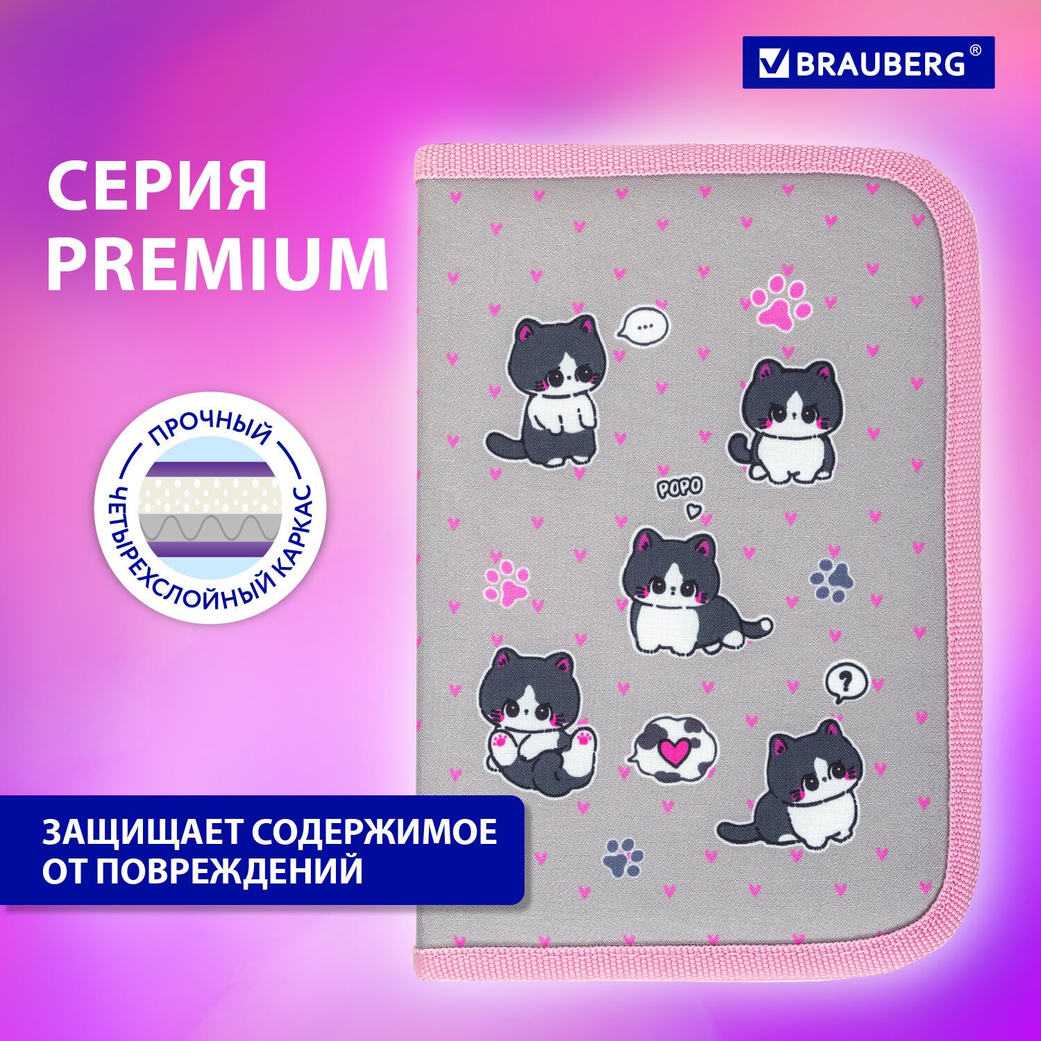 Пенал BRAUBERG, 1 отделение, полиэстер, 21х14 см, "Cat patches", 272327