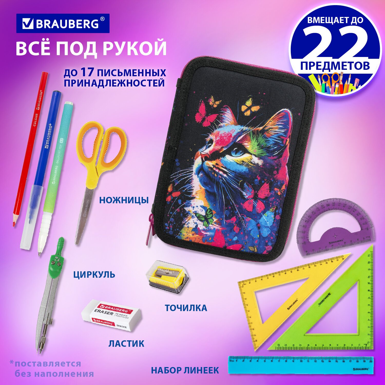 Тканевый пенал BRAUBERG стандартного размера с двумя отделением. Удобная молния с трех сторон с металлическим бегунком, прочные резинки для предметов. Вмещает до 25 предметов.