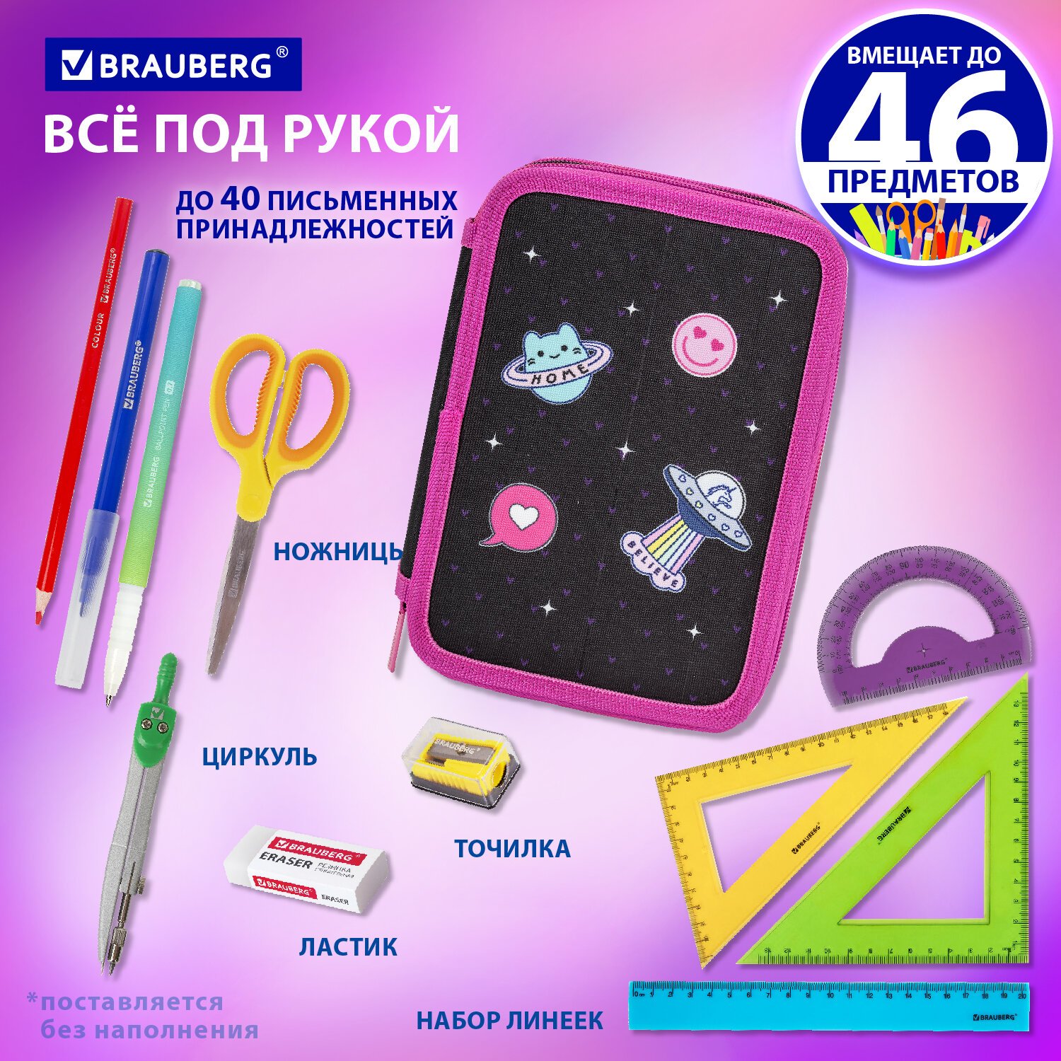 Тканевый пенал BRAUBERG "Space sweets" стандартного размера с тремя отделениями. Удобная молния с трех сторон с металлическим бегунком, прочные резинки для предметов. Внутри пенала – цветная печать. Вмещает до 46 предметов.