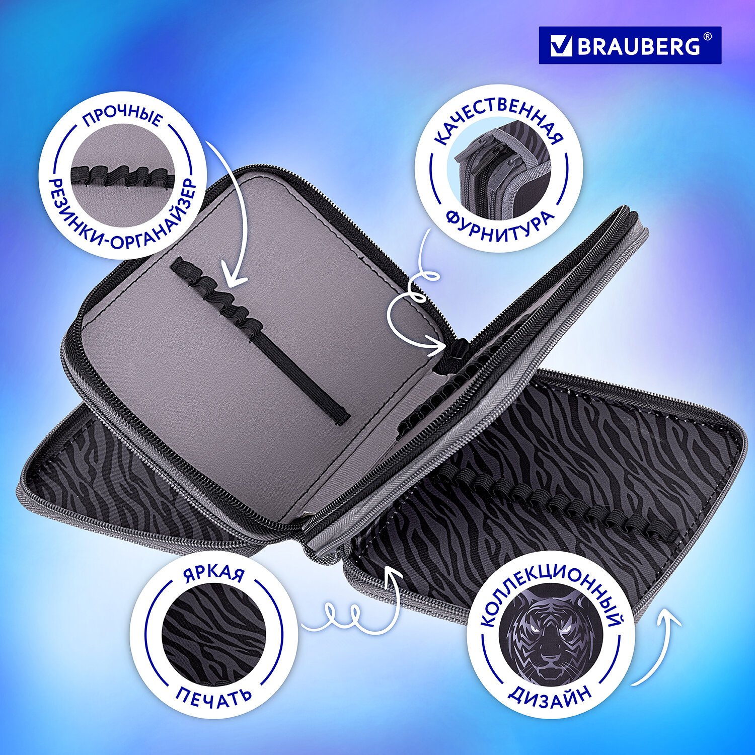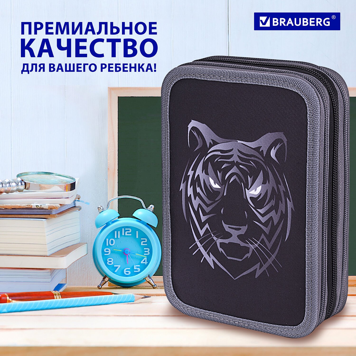 Пенал BRAUBERG, 3 отделения, полиэстер, 21х14 см, "Tiger", 271551