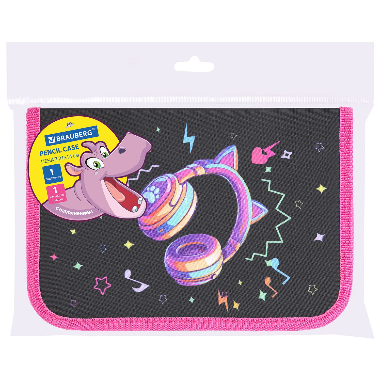 Пенал BRAUBERG с наполнением, 1 отделение, 1 откидная планка, 24 предмета, 21х14 см, Headphones, 273531
