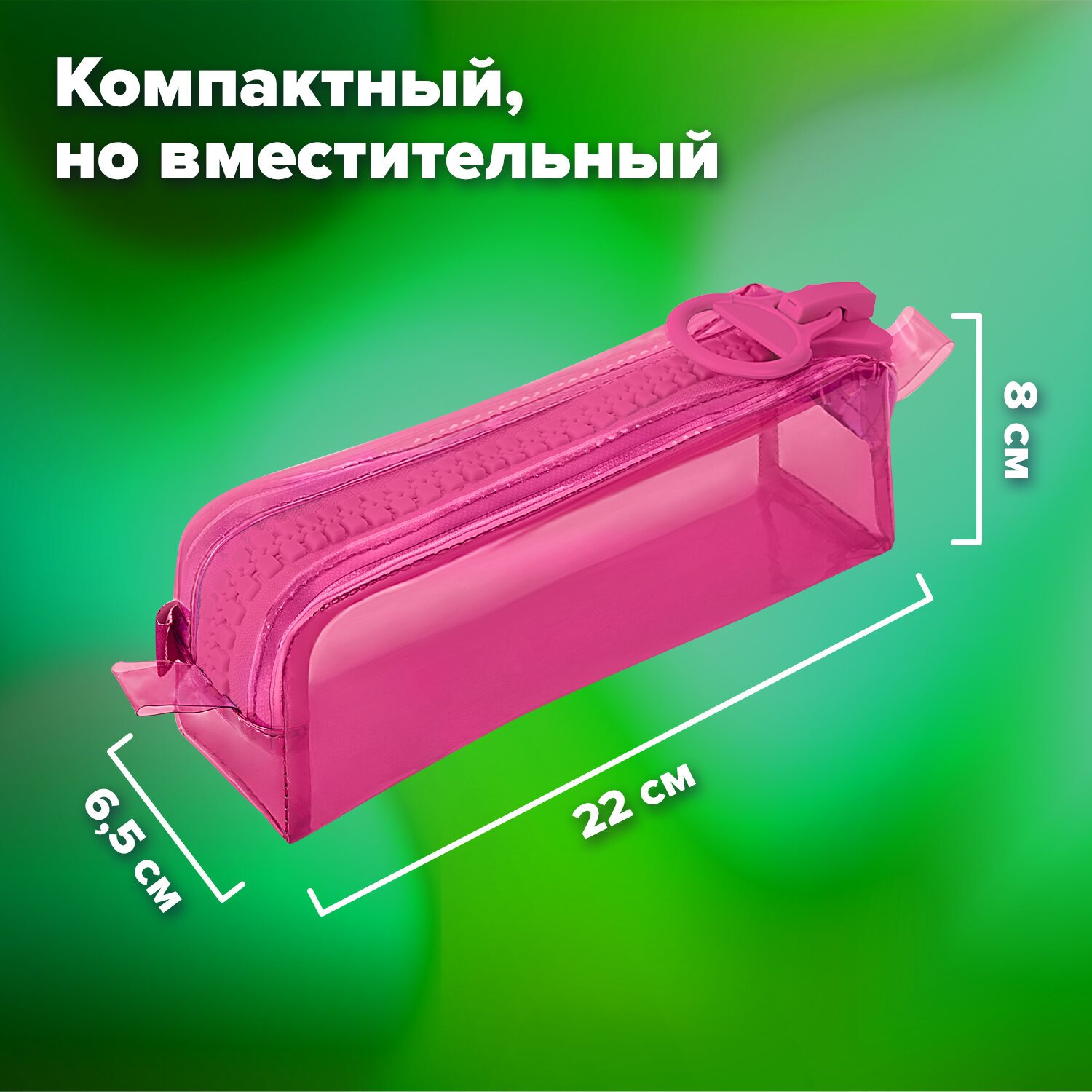 Пенал выделяется среди аналогов объемной "тракторной" застежкой-молнией с увеличенным бегунком. Имеет оптимальный размер для размещения в нем не только канцелярских принадлежностей и принадлежностей для творчества, но и повседневных мелочей, аксессуаров, таким образом может выполнять роль универсального несессера, который можно всегда взять с собой.
