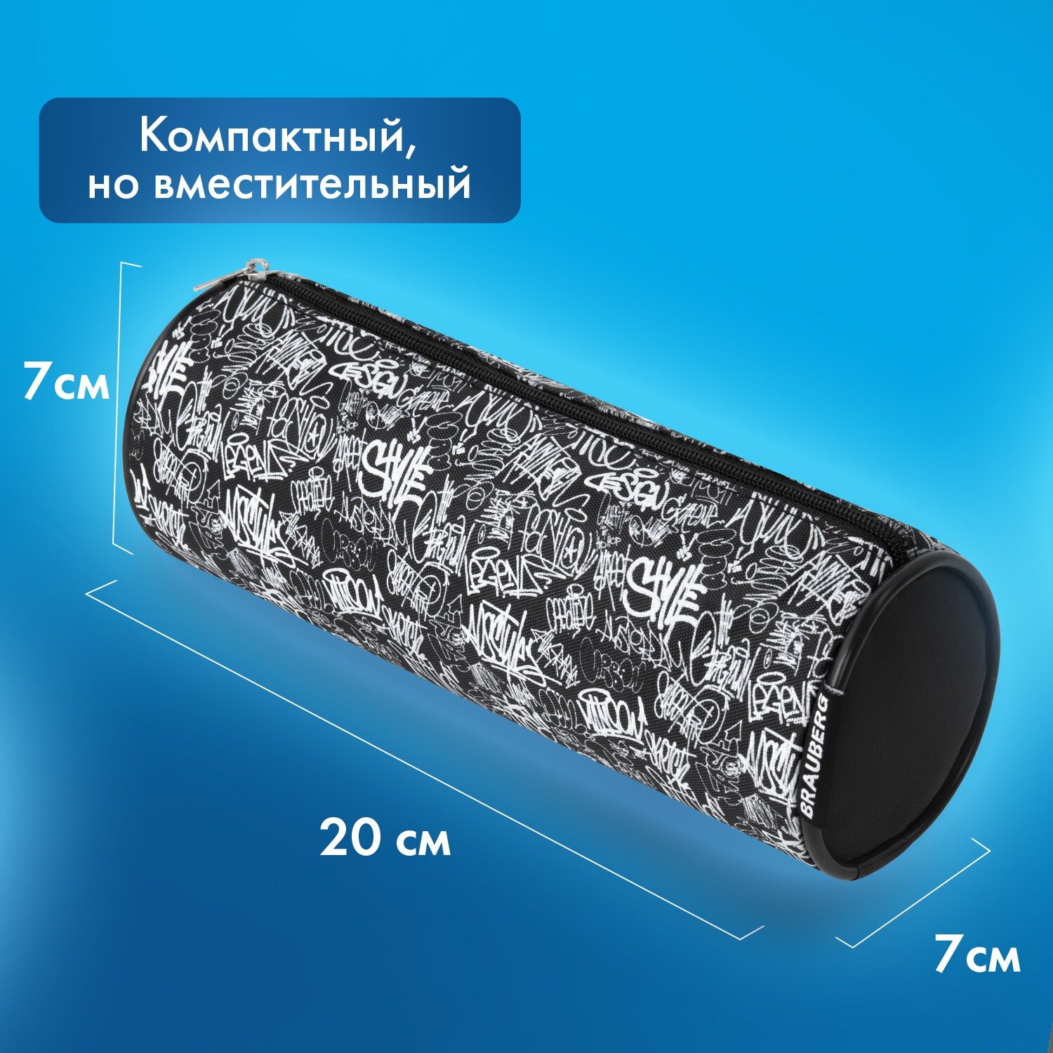 Пенал BRAUBERG "Graffiti" выполнен из прочного мягкого материала с рисунком граффити. Пенал вмещает до 50 канцелярских принадлежностей стандартных размеров. Надежная молния оснащена удобным металлическим бегунком.