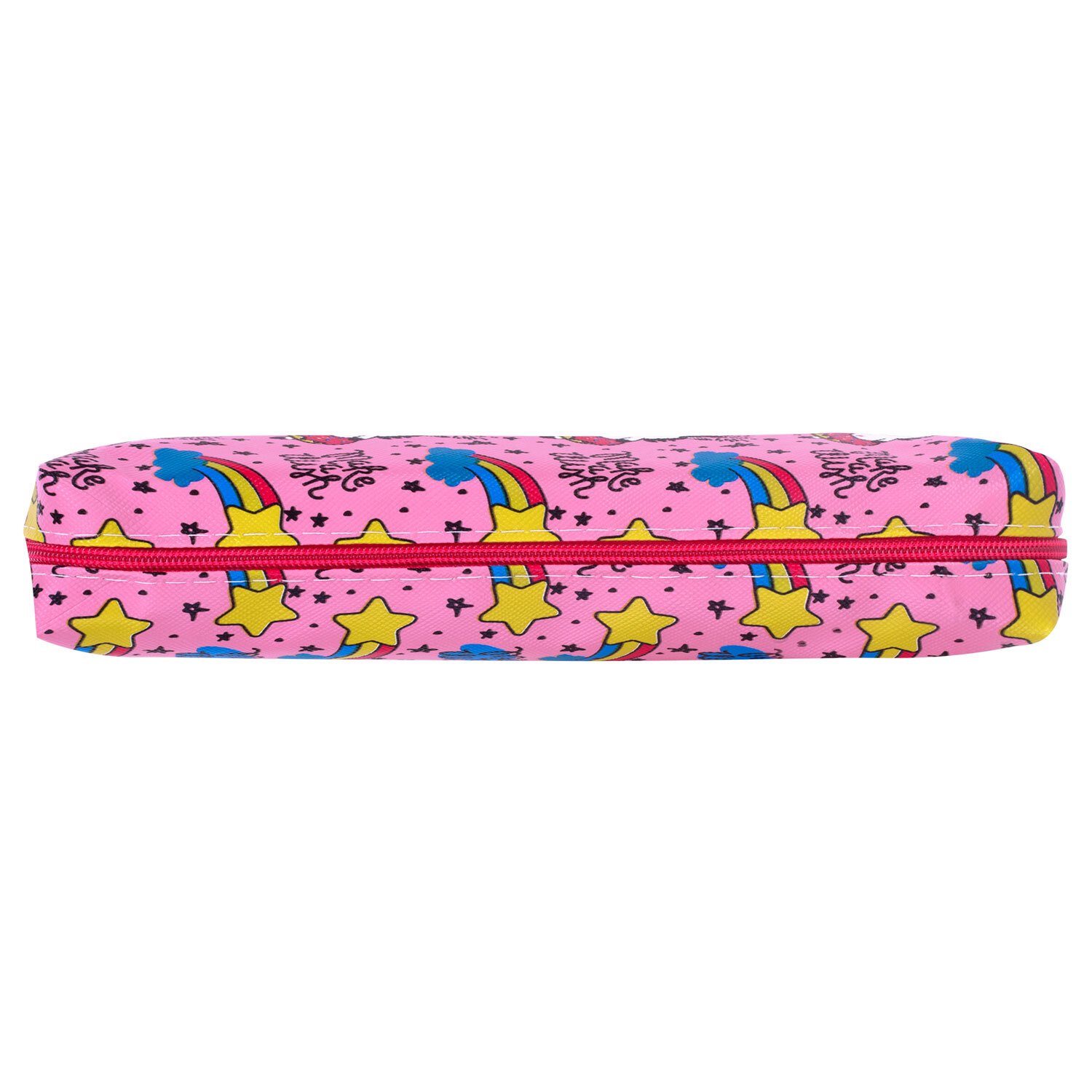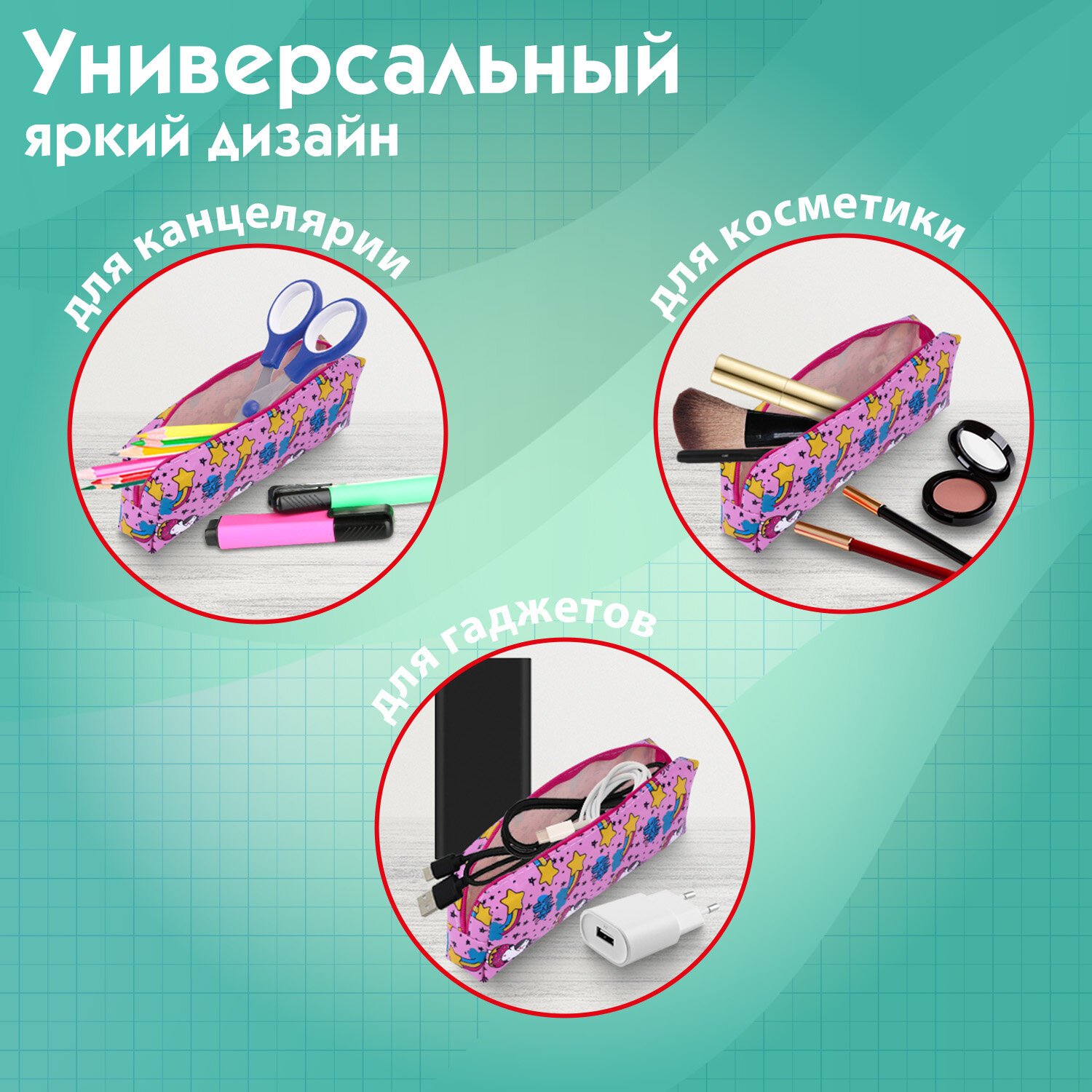 Пенал имеет оптимальный размер для размещения в нем не только письменных принадлежностей, но и повседневных мелочей, косметики, аксессуаров, таким образом может выполнять роль универсальной сумочки-косметички, которую можно всегда взять с собой. Удобно открывать и закрывать, держась за металлический бегунок.